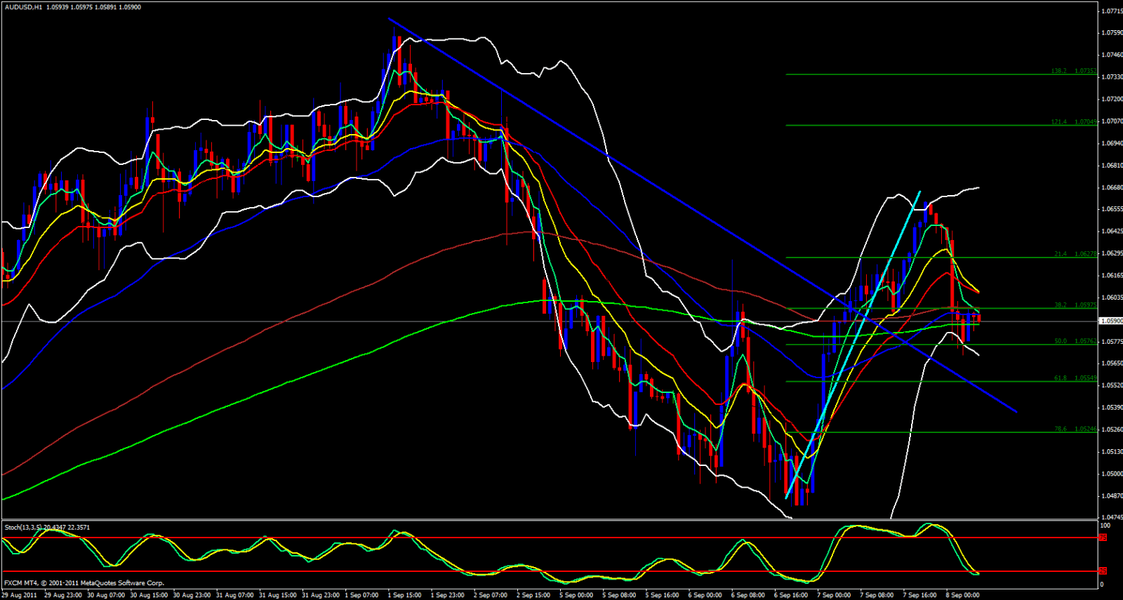 Looking at the hourly the 5 ema has crossed below the 13, 21 and 55 and the lower Bollinger Band is pointing down. There could be a bit of support around the 1.0575 area since that is a 50.0 Fib of the recent rise up but everything else is pointing down. 15 Minute chart is also looking very bearish to me at this time. 1.0565 is the Monthly Central Pivot Point so I will be watching for a break at this level before I would consider a short.