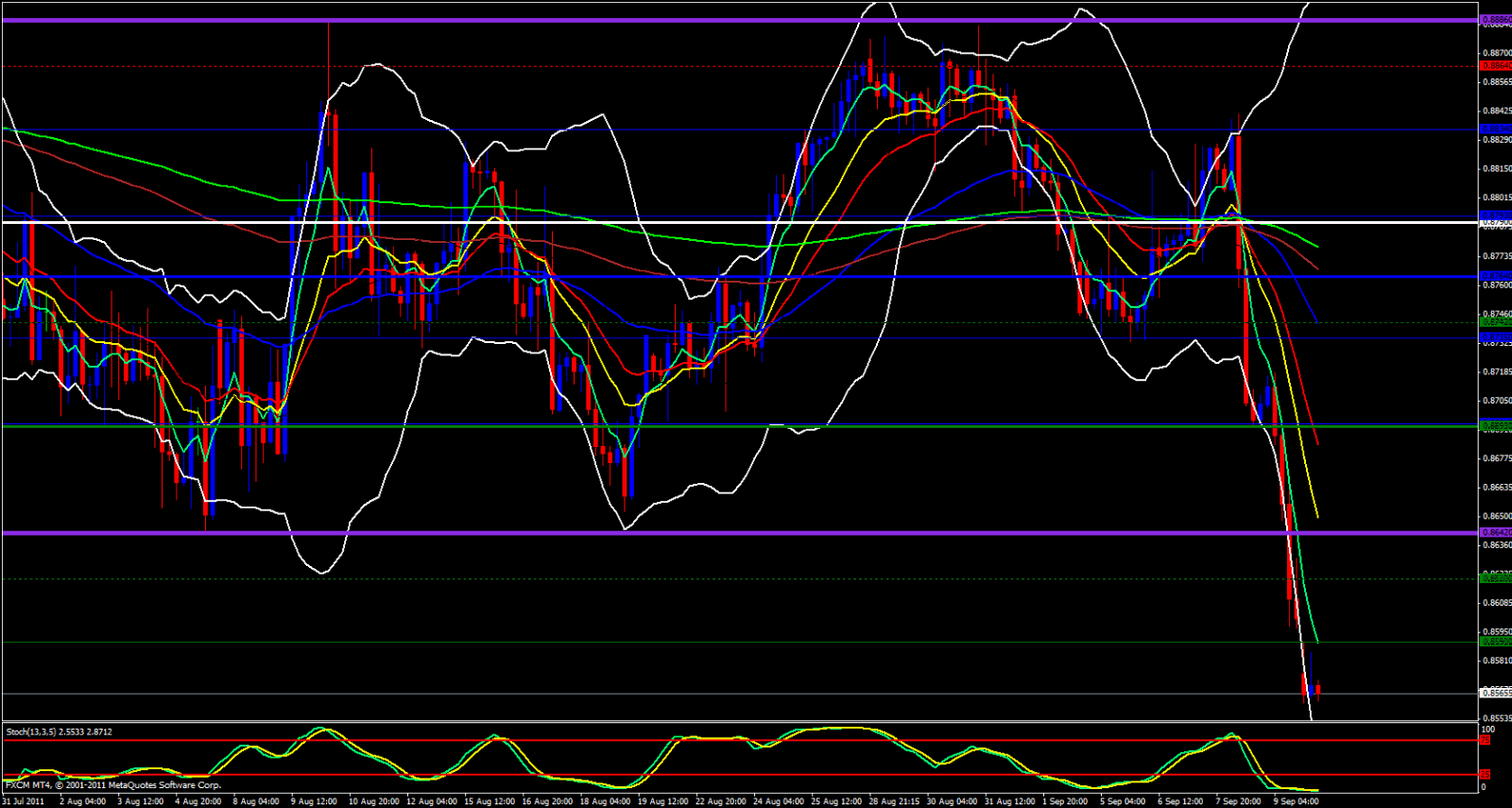 On the 4 Hour we are about 26 pips away from the 5 ema and I expect that 0.86 should be a strong area of resistance and a good place to look at further shorts. If taking shorts at 0.8600 set a stop at around 0.8625 and look for a profit target 0.8560.
