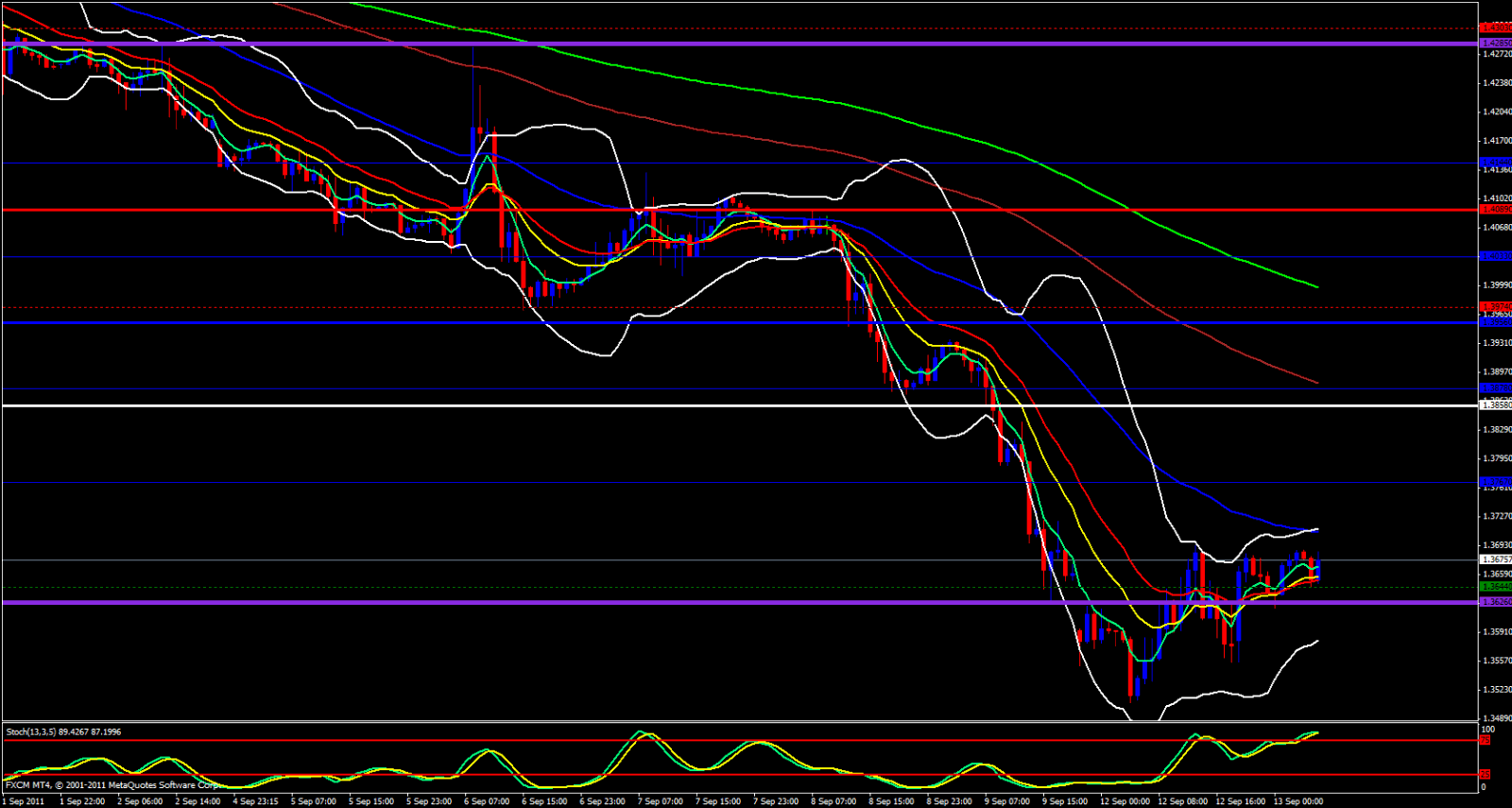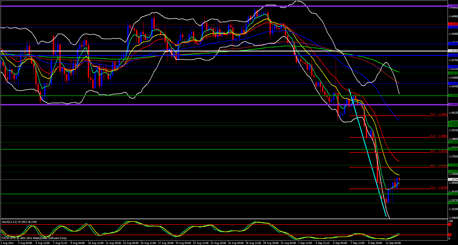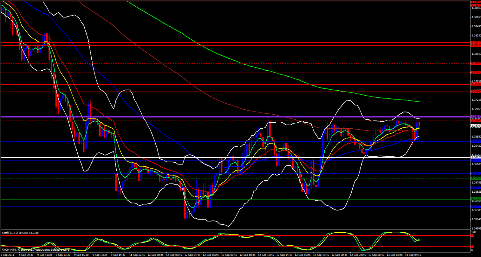 The Stochastics on both the Hourly and 15 Minute charts are in the overbought zone as well. At this point, if I had to pick a side I would probably lean bearish, only because I see more resistance in the way than support. Consider taking shorts off the 1.3690 area if it reaches that level or wait for price to fall down to the Daily Central Pivot Point at 1.3622, then to Fib back up to around 1.3650 area then look to take a short with a 20 pip stop loss. Price could continue upward, but with all the ema's and Monthly Pivot Points in the way, longing this pair would be a bumpy road.