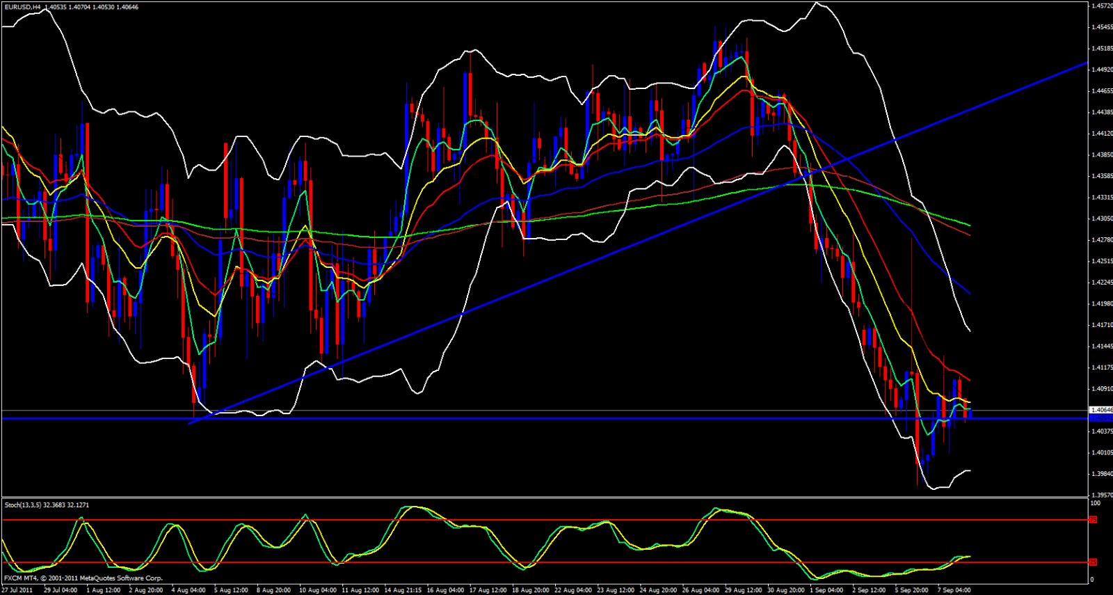 Today the EUR/USD looks very similar to how it looked yesterday. At the time I amm writing up this analysis the daily candle is red and below the 233 ema with the 5 crossing sharply downward and poised to cross through the 233 ema. What cannot be ignored is that price is just above what has been a very strong line of support at the very powerful psychological level of 1.4 going all the way back to March of this year.