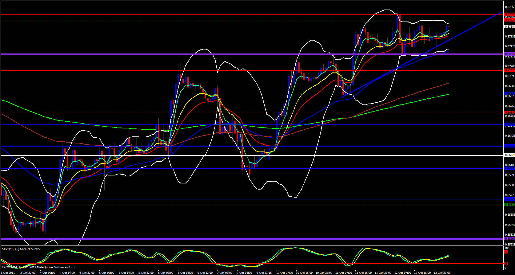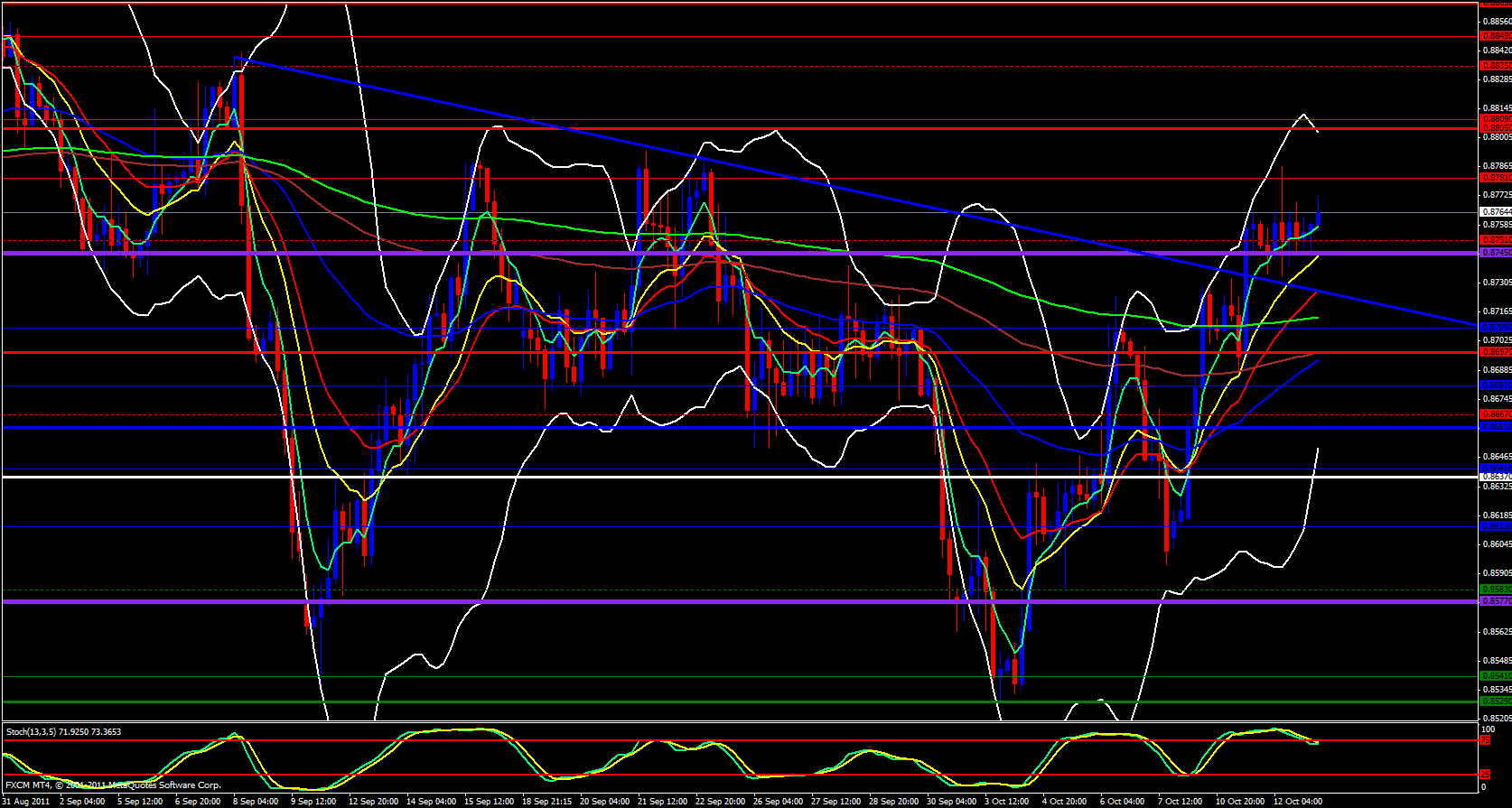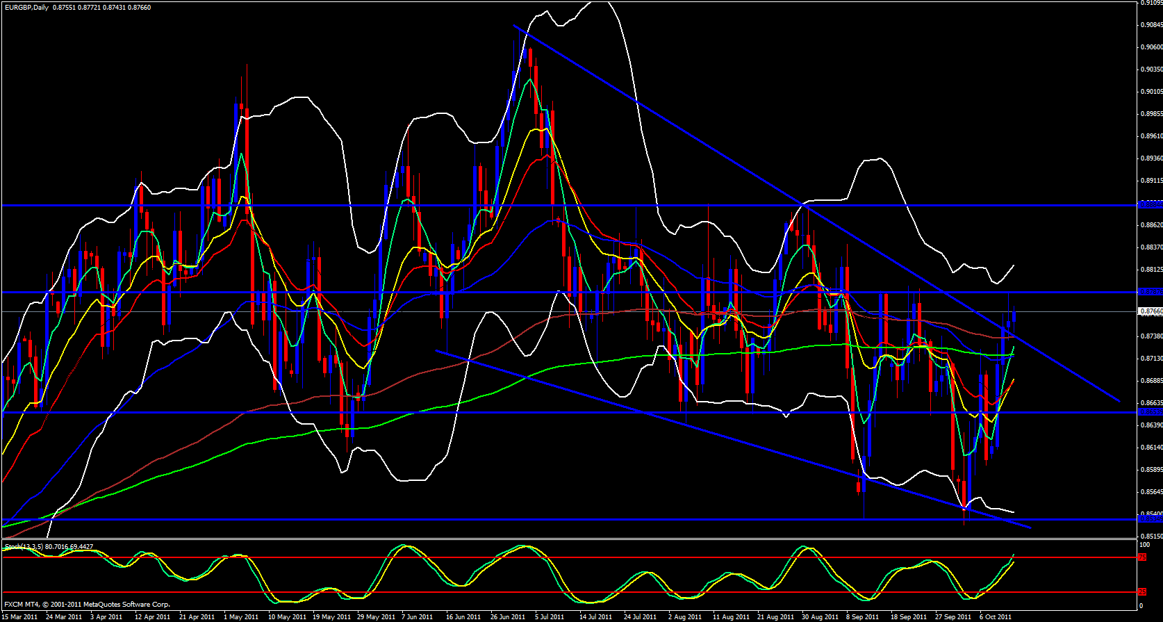 The weekly candle has busted above a descending trend line and the stocastics is crossing up out of the oversold zone and the 5 ema is pointing upward and beginning to cross the 55 ema and it looks like it can soon cross the 13 and 21 ema's as well. Moving over to the daily chart it is very obvious that we have broken and retested the descending trend line and is already heading back up. The 5 ema has crossed above the 55 and 233 and heading north. Stochastics is pointing straight up as is the upper Bollinger band. Still, a horizontal resistance line exists at 0.8788 so we must break that level before I will be convinced we are in a breakout.