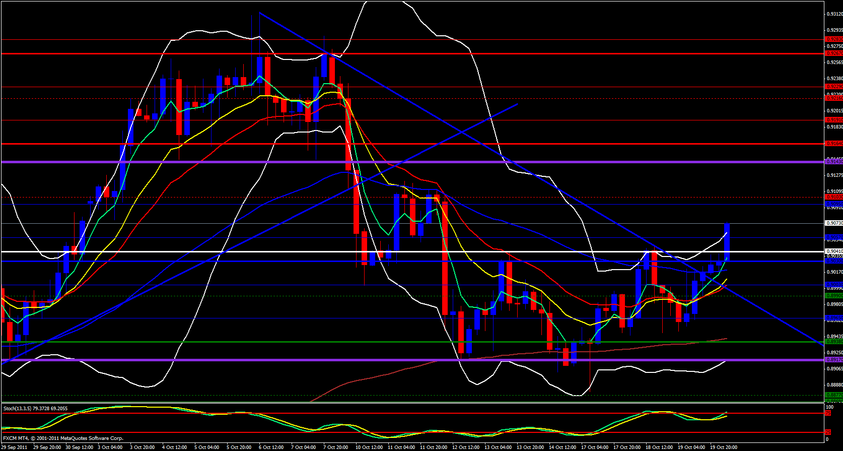 Moving on tot he hourly chart the upper Bollinger band is open and pointing up and price is riding the 5 ema. The weekly M3 is at 0.9097 so it is there I would expect price to stop and retrace back down to the 5 ema giving an opportunity to find an entry.