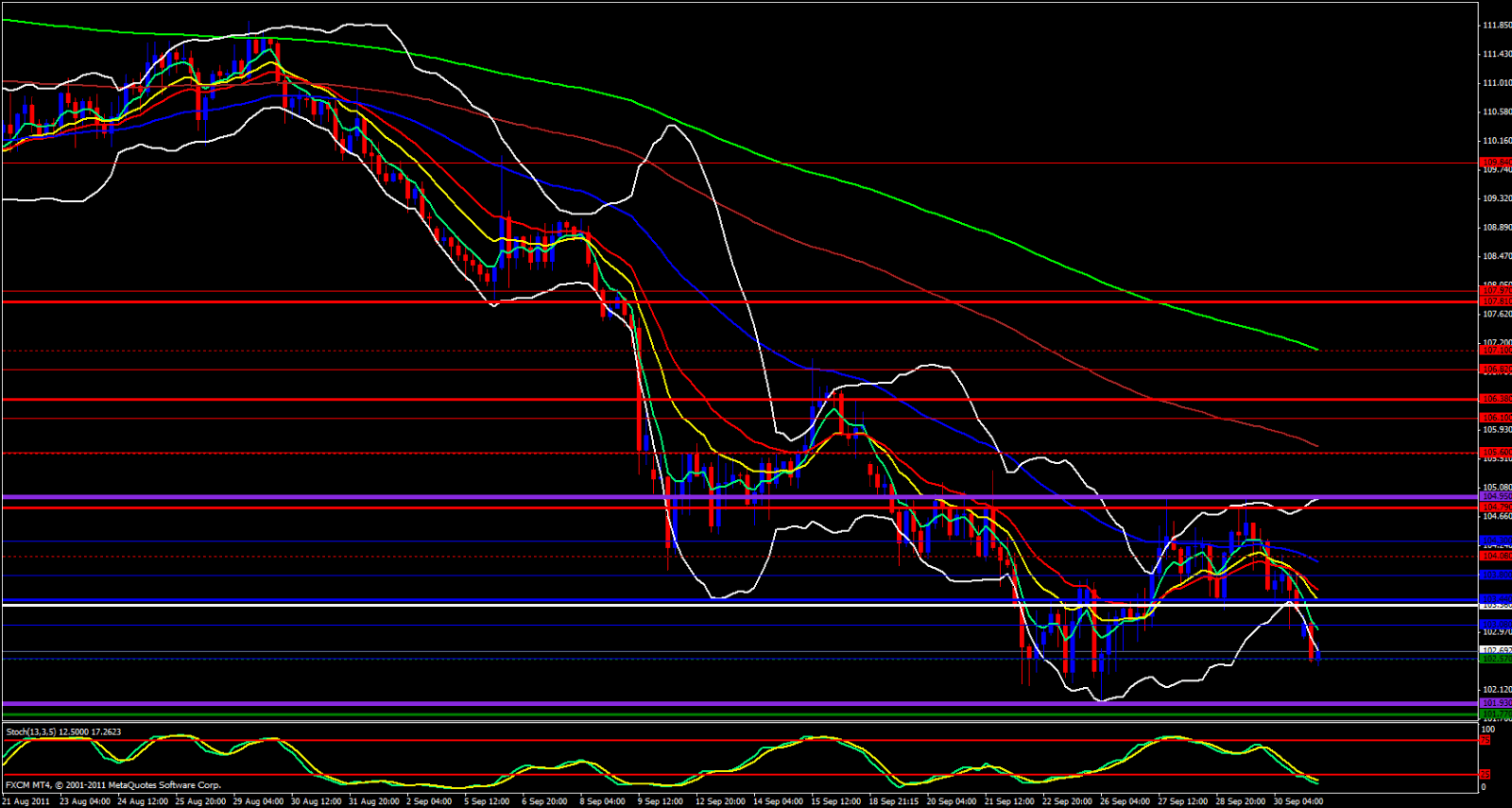On the weekly and daily charts price continues to ride the ema's down. Price is below the Monthly, Weekly and Daily Central Pivot Points, bearish indications in itself, and it continues to ride the 5 ema on th 4 hour as well as the hourly charts.