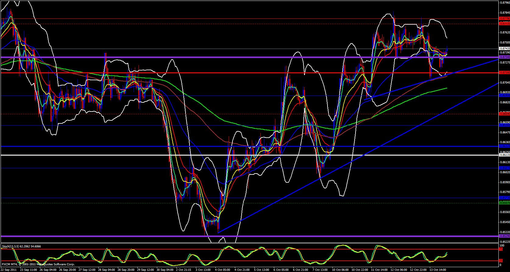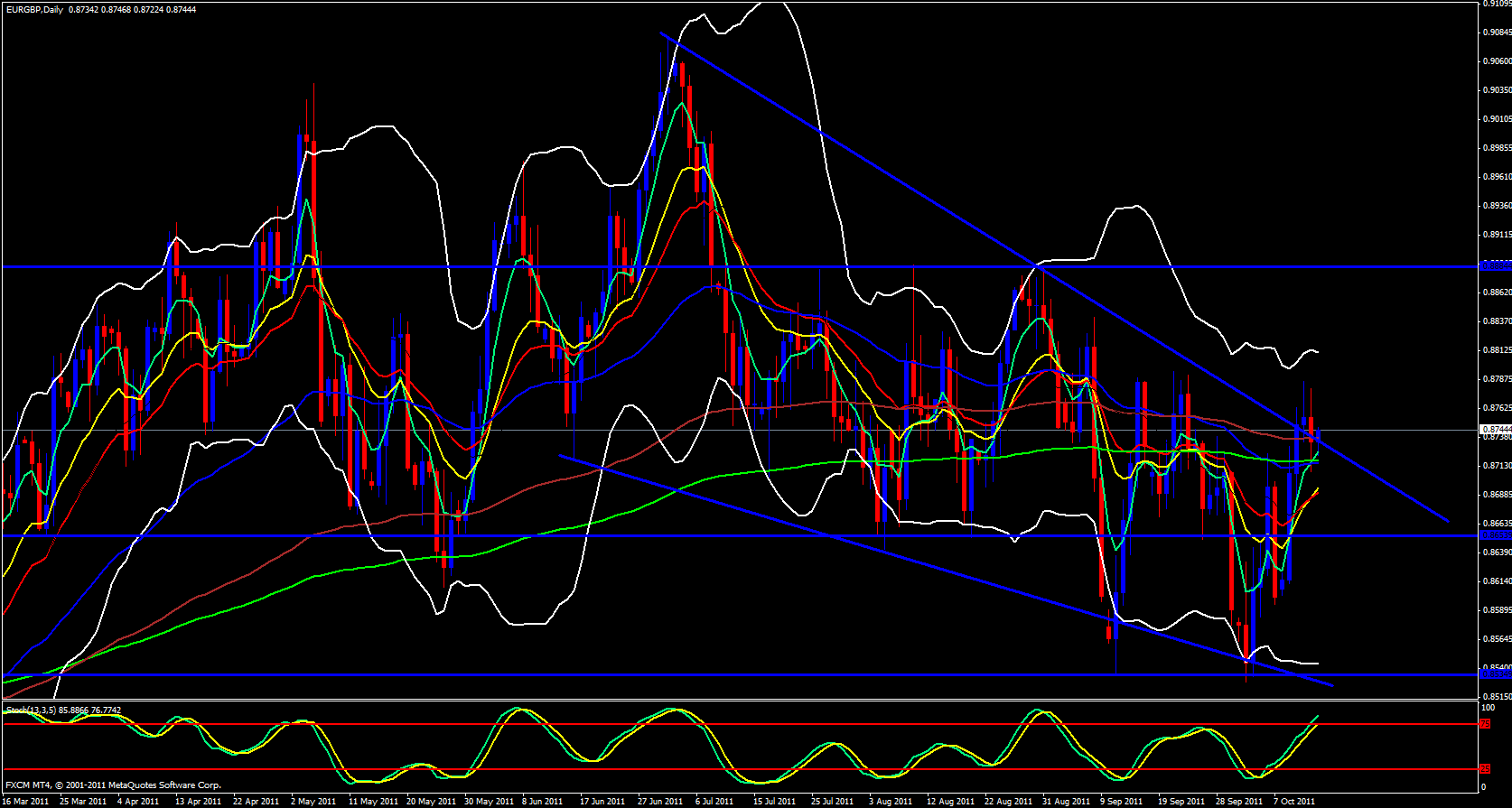 Now I am looking at the EUR/GBP daily chart and what I see only confirms what the EUR/CHF and GBP/CHF has already told me. This week we broke a trend line then came back to the retest and touched the daily 5 ema and now we heading up. Looking at the 4 hour we are up against last month's high but it looks as though it may be broken.