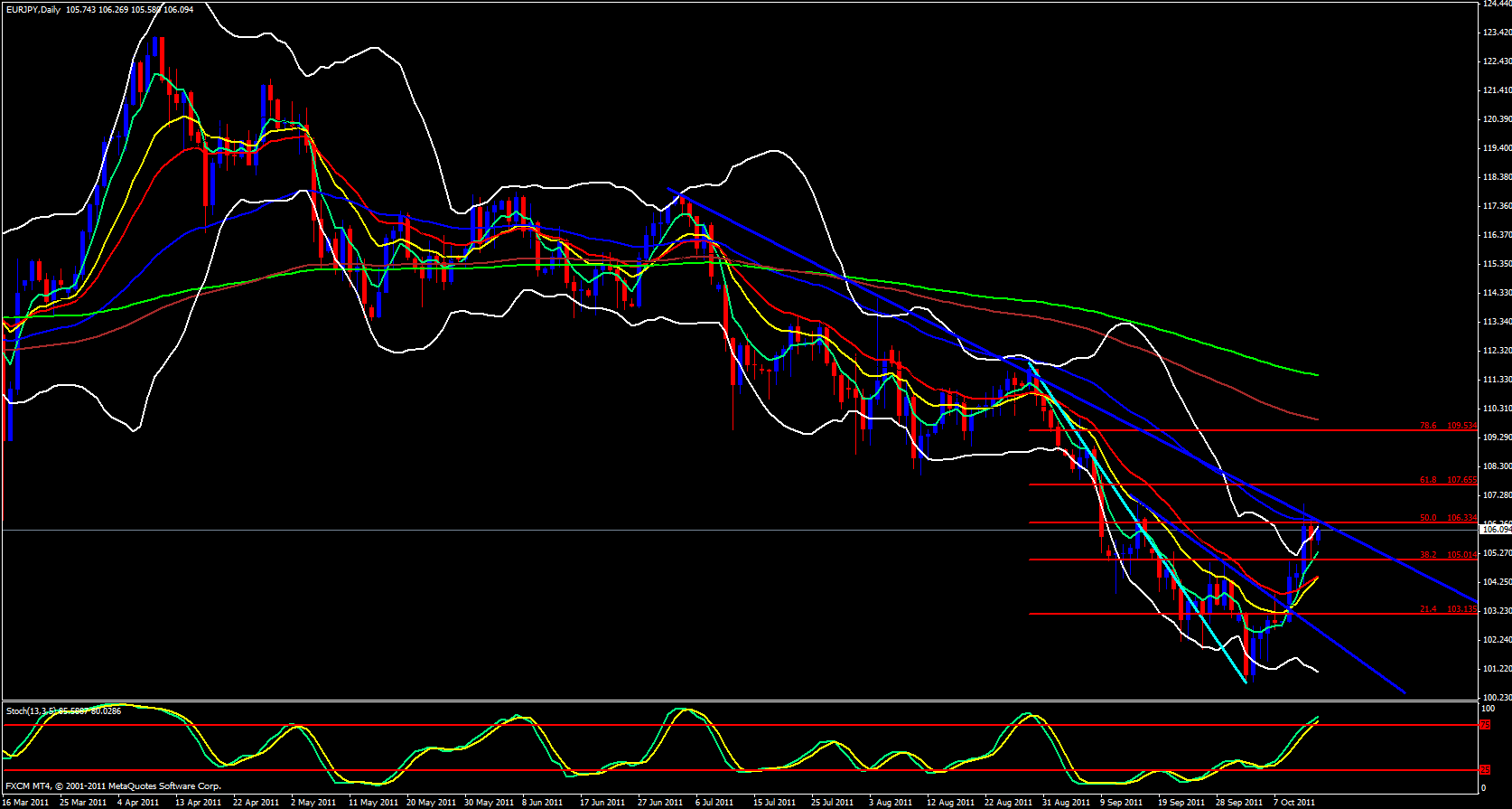 Looks very familiar if you compare it to the EUR/USD but then again, why shouldn't it? I think the USD today is a bit stronger than the JPY and I think the EUR will be stronger than the USD so if the USD is stronger than the JPY and the EUR is stronger than the USD then the EUR will be much stronger than the JPY so I am going to watch for this daily trend line and 55 ema to get busted.