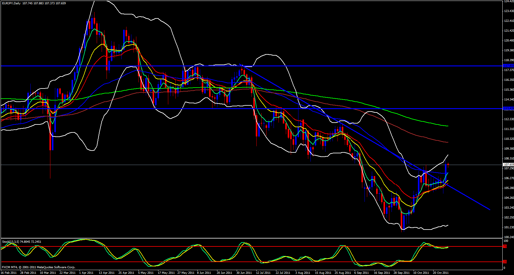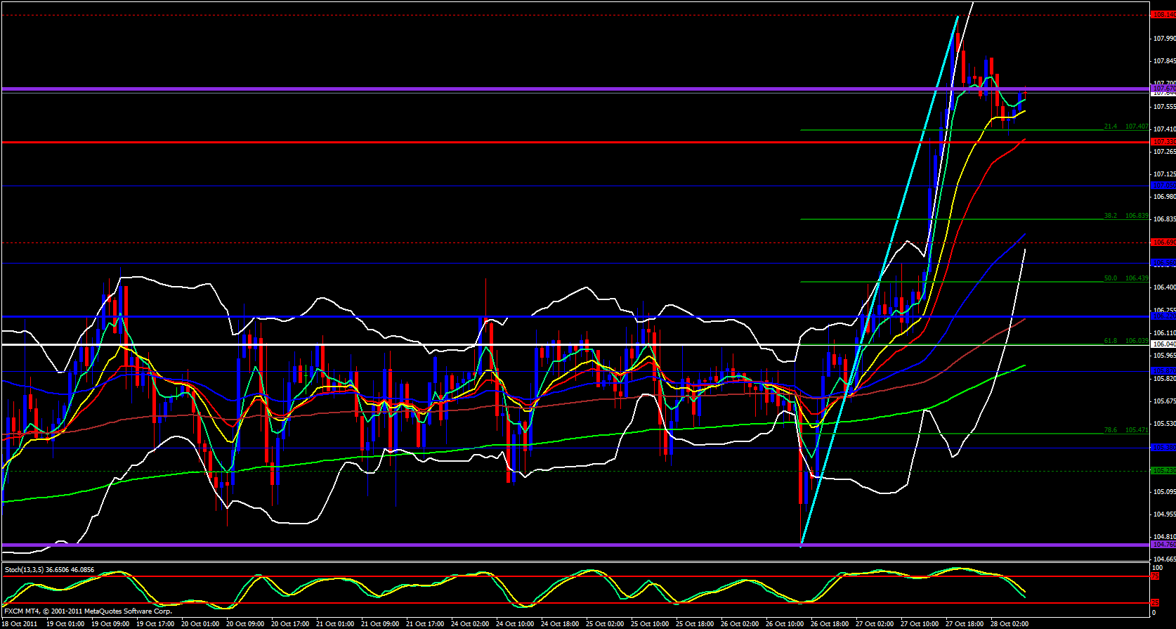 After yesterdays steep move up, I do expect a retracement. On the daily chart we totally broke above the trend line. Intense moves such as the one we had yesterday are usually followed with consolidation. Briefly glancing at the weekly chart price is approaching the 38.2 fib of the last major move down and the 38.2 is nearly overlapped with a 21 ema. This 38.2 fib is at the 109.36 price level.