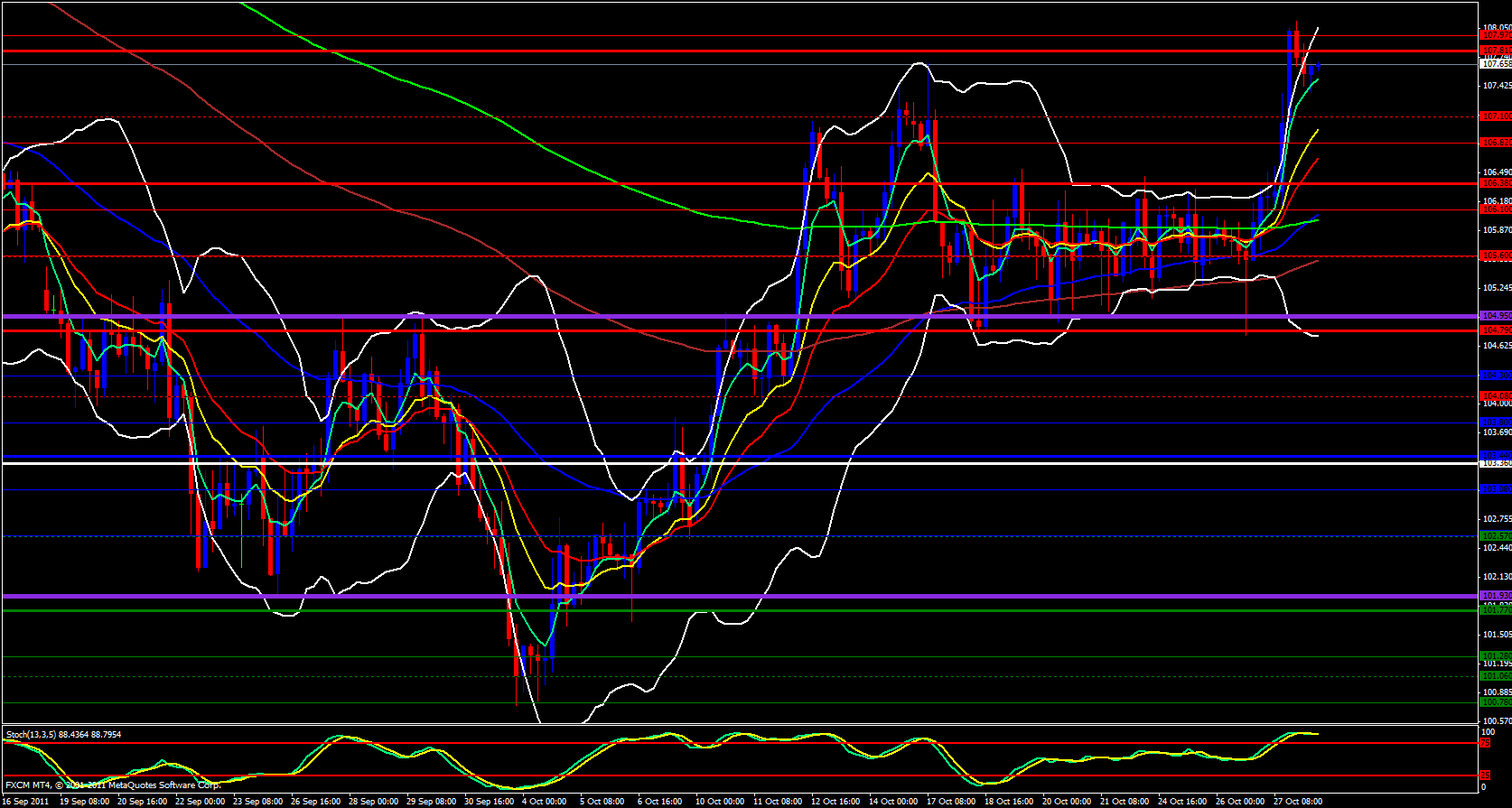 Finally, on the 15 minute daily pivot chart price is just below the M3 at 107.92 and the daily pivot below price is at 107.17. Stochastic is in the overbought zone and I expect price to retrace back to possibly the central pivot before continuing on up.