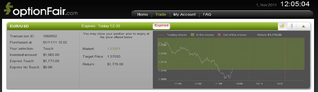 With optionFair™ Binary Options Trading Platform, I traded $1,000 on the “Touch” instrument. This kind of option has a return of 77% if the option will touch the strike price prior to expiry. If the signal is correct, I could get a return of $720 on my investment. The market price for EUR/USD at the buying time (12:02) was1.3694 and the target price was 1.37030. The EUR/USD price hit the strike price before the expiry at 12:30 and I won the position, earning $720!