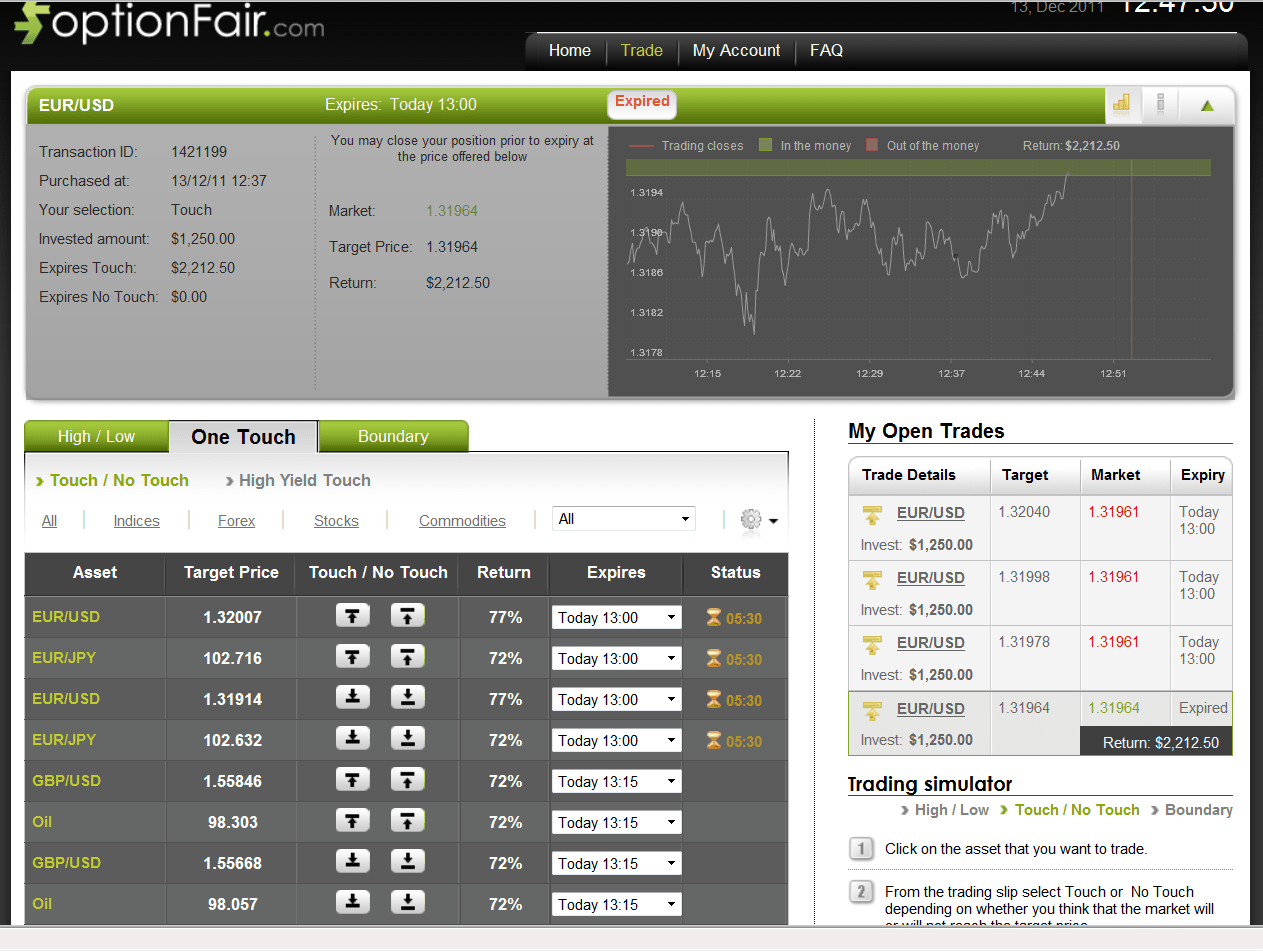 With optionFair™ binary options trading platform, I traded on a $1250 on the "Touch" instrument. This kind of option has a return of 77%, if the option touches the strike price prior to expiry. The market price for the EUR/USD at the buying time (12:38) was 1.31882 and the strike price was 1.31964for the expiration of 13:00. At 12:47, nine minutes after I opened my position the pair touched my strike price and I won 962.5$.