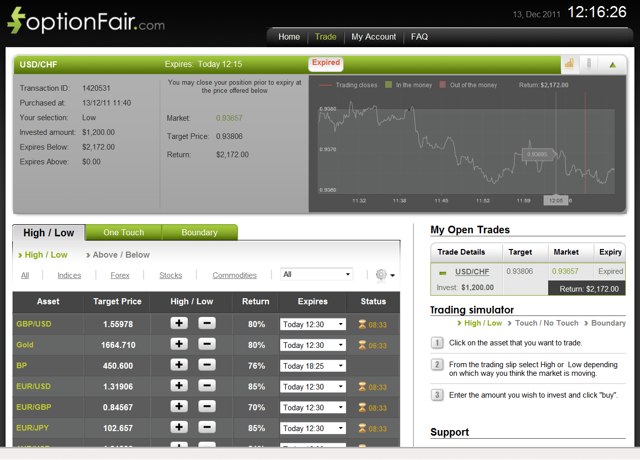 The market price for the USD/CHF at the buying time (11:40) was 0.93806. The expiration took place at 12:15 at the price of 0.93657, 15 pips below the strike price which earned me 81% on my 1200$ investment.