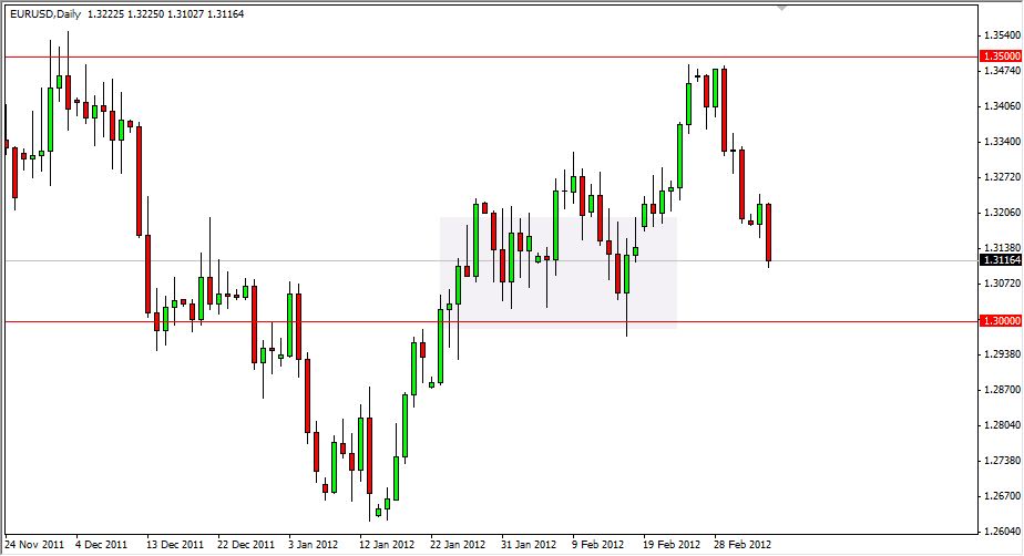 EUR/USD continues to soften up as the trading world worries about everything European. The session on Tuesday saw more selling of this pair, and there are plenty of reasons being bandied about the newswires for the session. While the exact nature can’t be known, there is a lot of attention being paid to the Thursday announcement of how many private investors are willing to participate in the “voluntary haircut” in the Greek bond markets. The softness is simply based upon a lack of “knowing” what will happen, and the unknown is always bearish for risk assets such as the Euro.