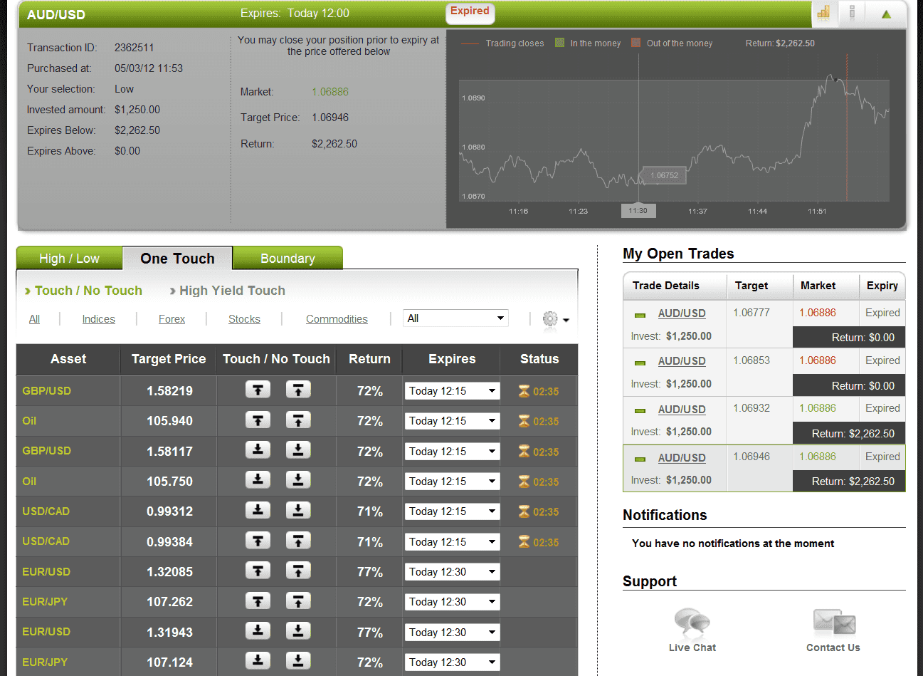 I logged into the optionFair™ Binary Options Trading Platform at 11:53 and I traded $1,250 on the “Low” instrument for the expiration of 12:00 in a strike price of 1.06946. This kind of option has a return of 81% if the option expires below the strike price at expiry time, which means I’ll earn $1,012 on my investment.