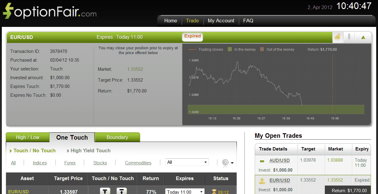 With optionFair™ Binary Options Trading Platform, I traded $1,000 on the “Touch Down” instrument. This kind of option has a return of 77% if the option touches the strike price prior to the expiry. That means that if the signal is correct, I could get a return of $770 on my investment. The market price for the EUR/USD at the buying time 10:35 was 1.33622 and the target price was 1.33552. At 10:40 the market hit my target price and I won $770 in 5 minutes!