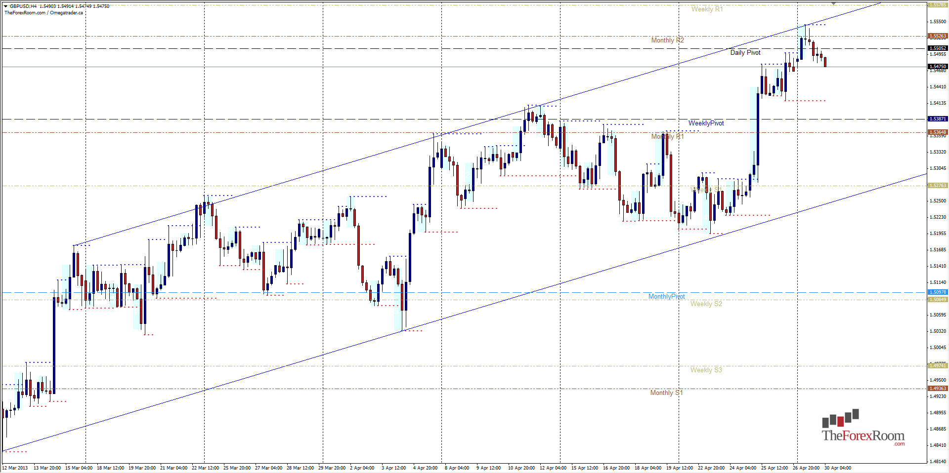 The GBP/USD traded as high as 1.5545 yesterday and closed as a daily pin bar reversal from this level as well as double Pin Bars on the 4 Hour Time Frame. If we look at a 4 hour chart, the upward channel is perfectly clear and yesterdays high marks another notch on the channel's belt, so to speak. Currently the pair is resting on support at last week's highs close to 1.5475 but appears to be staging a run by the bears in during Asian trading. If price cal close below 1.5475 on a 4 hour or higher time frame, there is tremendous downside potential with the lower band of the channel residing at roughly 1.5275, in line with the Weekly S1. There are plenty of hurdles in the way of course, such as the mid April highs/last week's lows around 1.5400. The Weekly Pivot sits at 1.5387 and there are plenty of highs lining up with the Monthly R1 at 1.5365. If yesterday's high is broken however, this will be what is called 'Fading The Tail' and will certainly bring 1.5600 into play as the next target before we possibly encounter January's lows at around 1.5675. Considering the reversal candle on the daily chart formed at the Monthly R2, this trader for one will be looking for selling opportunities down to at least 1.5400.