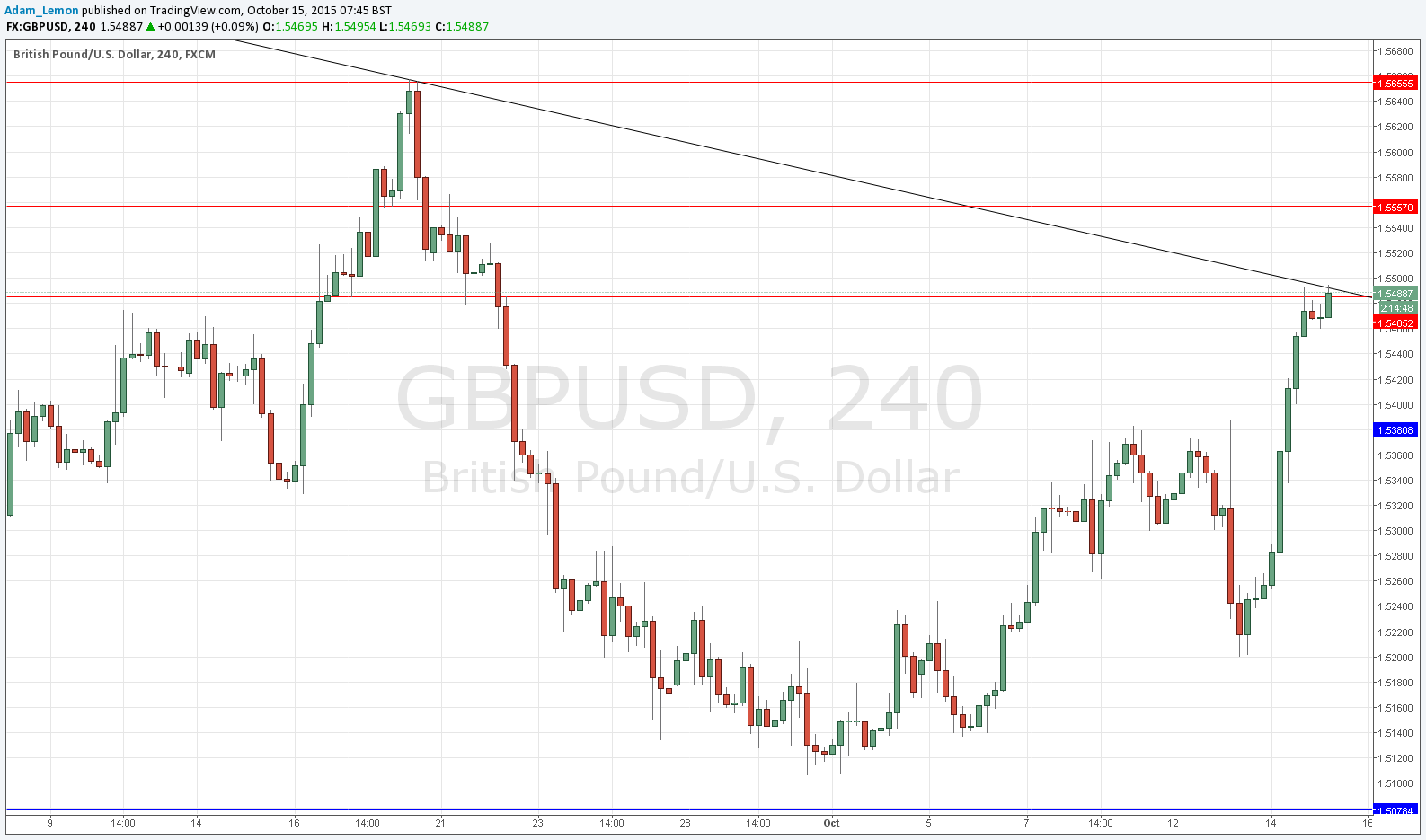 At the time of writing, the price is being held at an interesting point: the confluence of anticipated resistance at 1.5487 and the second touch formation of a really obvious bearish trend line connecting some major recent swing highs. If the price cannot break through here and falls following the London open, then a retrace back to at least 1.5400 becomes probable today.