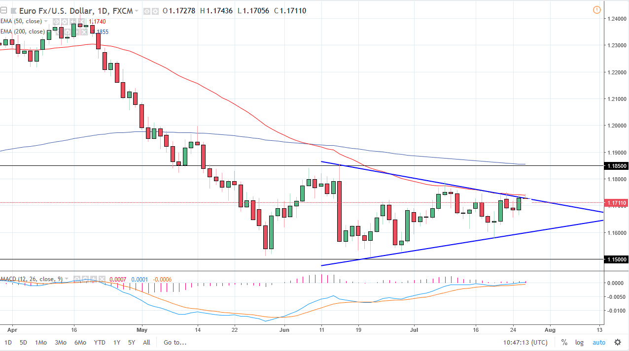 The Euro continues to be very choppy and range bound, as the market looks too tight to move. I think that the market will eventually make a decision, and as you can see on the chart I have a symmetrical triangle showing both support and resistance. The day ended up relatively unchanged, and that of course shows just how little faith there is an either currency right now. Overall, I think that if we can break out to the upside, it’s likely that we go to the 1.2500 level. Otherwise, if we break down below the uptrend line, then we go looking towards 1.15 handle. I suggest though that perhaps we are trying to form a bit of a basing pattern, and therefore a bit more comfortable for a move to the upside.