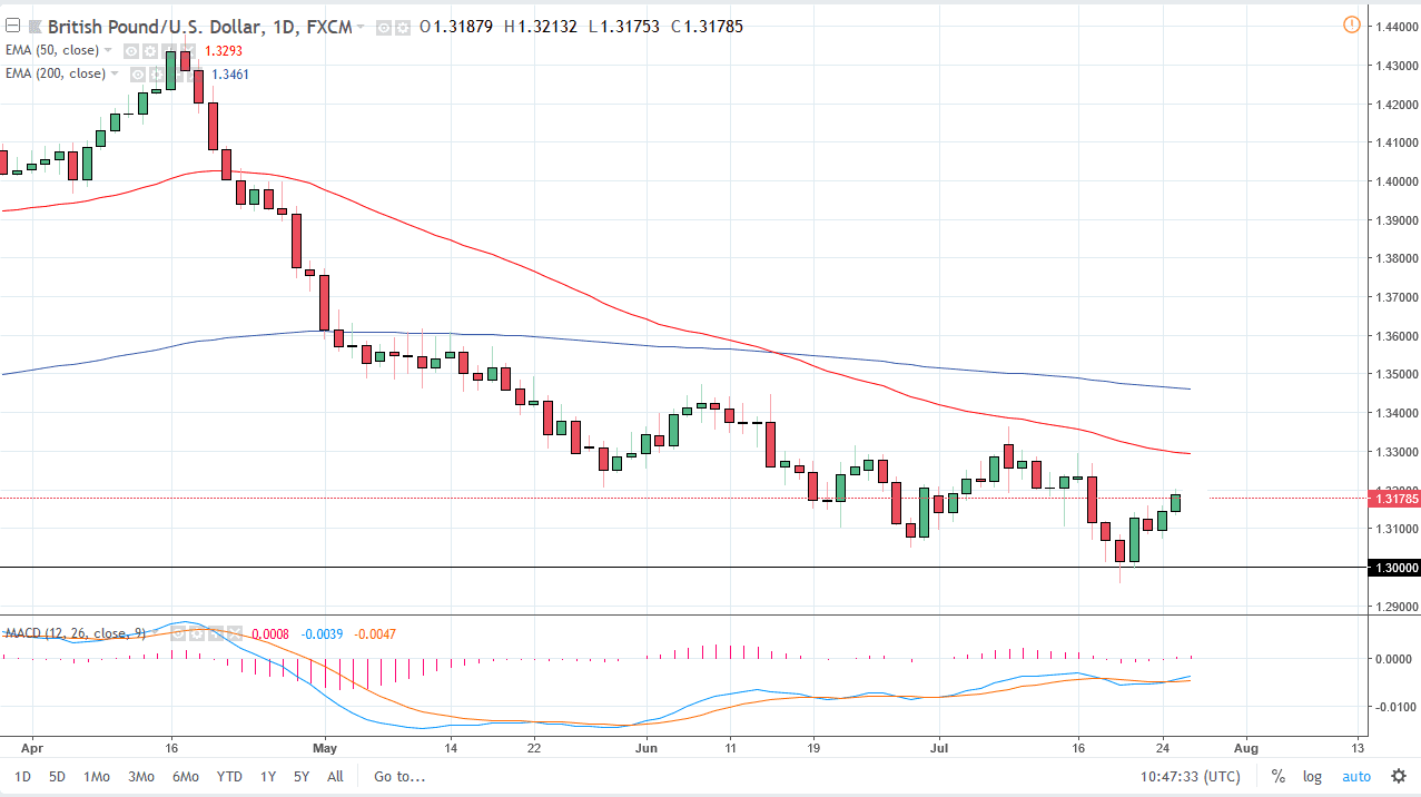 The British pound rallied a bit during the trading session on Wednesday, reaching towards the 1.3175 level as I record this. The market does look healthy though, as if we are trying to retake the 1.3250 level above, an area that had a lot of supply. Ultimately, I think that the market probably continues to find reasons to be very noisy, not the least of which will be political theater coming out of the United Kingdom, but in the end I think it looks as if the 1.30 level could offer a bit of a “floor” for the overall trend. If we are going to turn things around, that’s never a clean affair, so it would not be surprised at all if we had to pull back to find value hunters underneath. I look at the 1.33 level above as significant resistance, and the clearance of that level would be very bullish.