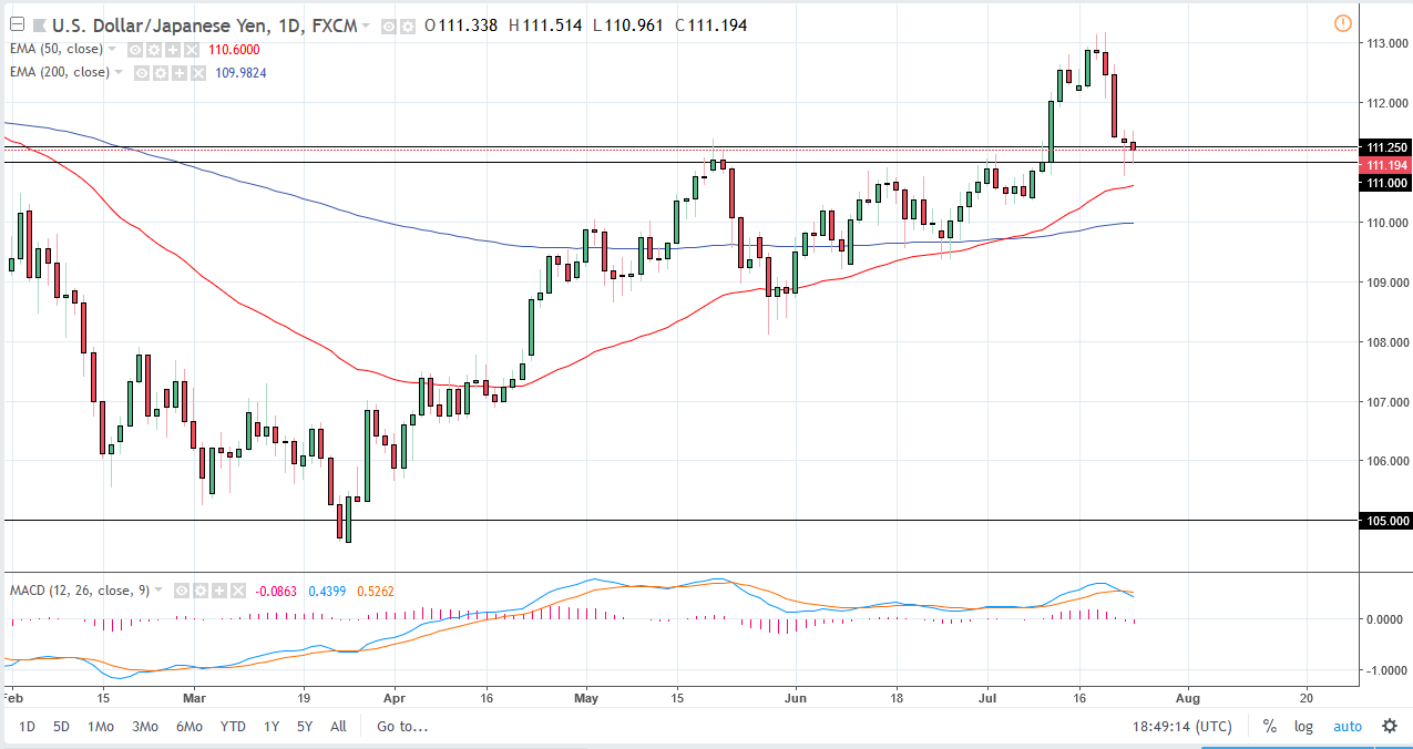 The US dollar has fallen against the Japanese yen during the trading session on Tuesday but continues to find support below at the ¥111 level, after we formed a hammer during the Monday session. I believe that the demand is going to start picking up in this area and offer an opportunity to pick up the US dollar “on the cheap” against the Japanese yen. I believe that the market will recovering go towards the ¥113 level above, but it’s going take a bit of time to get there. Overall, the market will more than likely find a lot of noise in the process as we had seen so much selling, but clearly there is a lot of support underneath. Beyond the level, you have the 50 EMA Crossing the 200 EMA, which is a longer-term “buy-and-hold” signal for some traders.