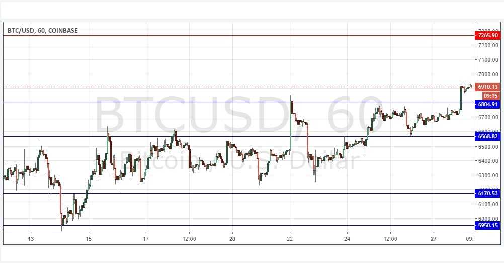 I wrote yesterday that there had definitely been a move towards a more bullish picture and a slow, medium-term bullish trend. For that reason, I took a weakly bullish bias above the support level at $6,569, noting thatabove $6,805 the price had room to rise significantly higher. This was a good call as the price remained above $6,569 and continued to rise, breaking also above the former resistance level at $6,805 which has now probably flipped to become support. I take a bullish bias today above $6,805.