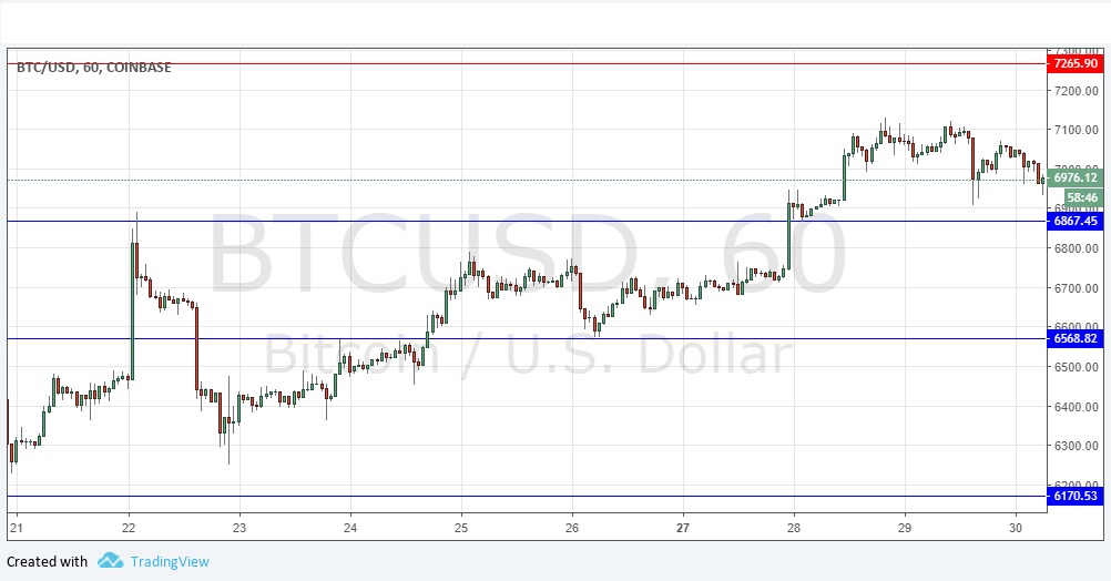 I wrote yesterday that the short-term action at $7,100 suggests that the price may be making a minor top and getting ready for a deeper retracement. I would therefore want to see the price break the high before being bullish today, or alternatively a pull back and strong bullish bounce at the support level of $6,867. This was a good call as after initially rising, the price failed at $7,100 before falling back, but has still not quite reached the support level at $6,867. Therefore, my call yesterday remains identical today. The picture remains generally bullish.