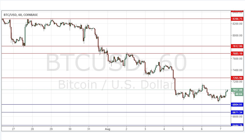 I took a bearish bias yesterday between $7,150 and $6,805. This worked out well for most of the day, as the price continued to fall, however it recovered later, and recent hours have been quite bullish, with the price reversing bullishly not far above the nearest support level identified at $6,805. I do not take a bias but there is short-term bullish momentum which suggests that the price is likely to rise further over the course of today.