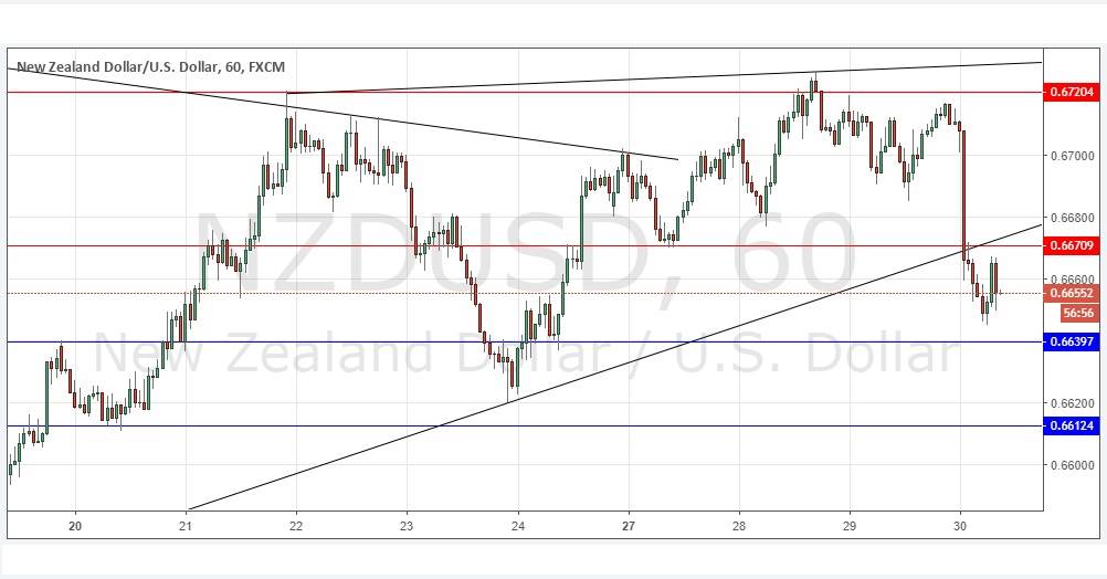I wrote yesterday that I would be bullish today above the new upper trend line which currently sits at about 0.6730. The price never got above that level, and instead made quite a strongly bearish break below the formerly supportive trend line. We now have a more bearish picture, and the confluence of new resistance at 0.6671 and the broken trend line close by looks attractive for a potential short trade entry, if the price returns to that area and clearly fails to rise, and then turns bearish. I would take a bearish bias at that point.