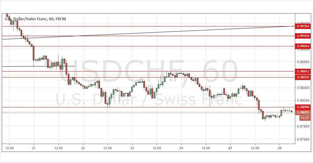 I wrote yesterday that the best opportunity which looked likely to set up would be a bearish reversal somewhere between 0.9850 and 0.9865. The price never quite reached 0.9850, but the daily movement was bearish. We now have another bearish sign to make the picture even more bearish: new, lower resistance at 0.9810. The price has a long way to fall before it will meet any support levels. Therefore, I take a bearish bias today below 0.9810. There is marked bearishness here, and unlike the EUR/USD currency pair, the CHF has room to advance without running into any obstacles.