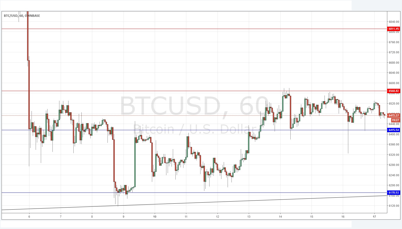 The price has been unable to recover by much from its sudden and dramatic fall a couple of weeks ago. The price is in a long-term consolidating triangle, but the key thing here is really the fact that the crucial resistance levels have held. The support level at $6,171 looks likely to be very strong as it is confluent with the supportive trend line from the triangle, whereas the higher support at $6,416 looks much weaker. In fact, I think it is likely to break down, which should trigger a further fall. Therefore, I would be bearish today following a strong reversal at $6,569 of after the price gets established below $6,416.