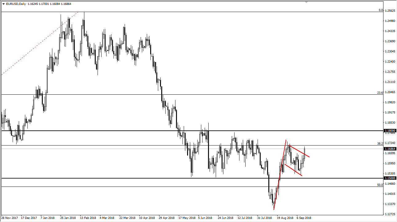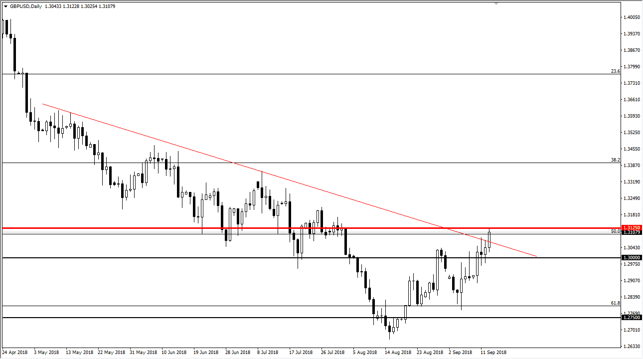 The Euro rallied significantly during trading on Thursday as CPI numbers in America missed. Interestingly enough, Mario Draghi suggested that the ECB would be in extreme easy mode until at least summer of next year, which wasn’t exactly bullish. However, the US dollar was the one punished. As a result it looks as if we are trying to break out to the upside. I have drawn a bullish flag of sorts on the chart, which I’m not necessarily convinced of quite yet as we are plowing right into major resistance, but if it does turn out to be true it signals a move towards the 1.20 level. I do think that eventually will get there, but I anticipate that we will probably get pullbacks in the meantime to try to collect more momentum. There is a lot of resistance at the 1.1750 level that extends to the 1.18 handle. Look for value and then take advantage of it.