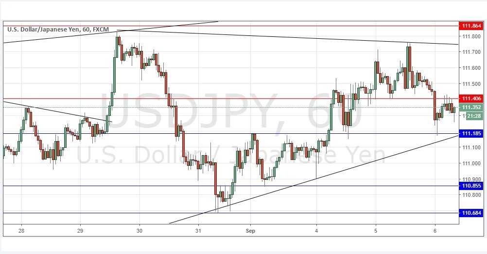 Yesterday's signals produced a long trade from the bullish pin candlestick which rejected the support level identified at 111.19. I would exit this trade at break-even immediately as it looks as if there is new resistance at 111.40 which is holding, making short-term movement very unpredictable, despite the medium-term weak bullish trend.