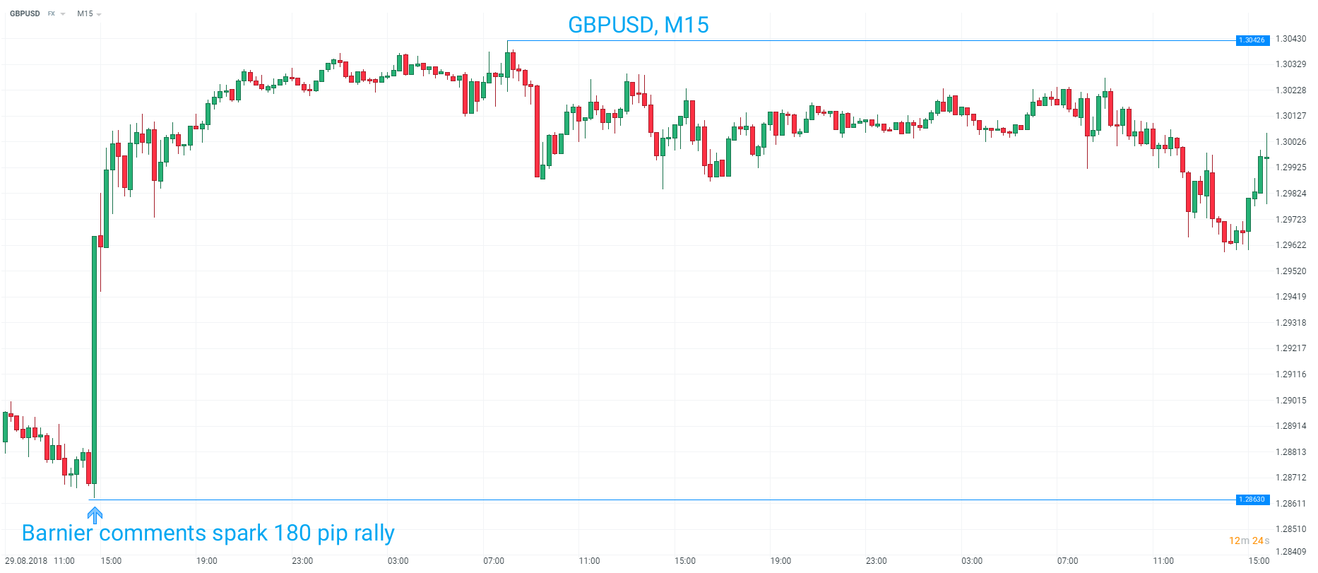 In late August 2018 the GBPUSD rallied around 180 pips in less than 24 hours following comments from Chief EU Brexit negotiator Barnier in which he stated the the EU wants to make a Brexit deal. (Source: xStation)