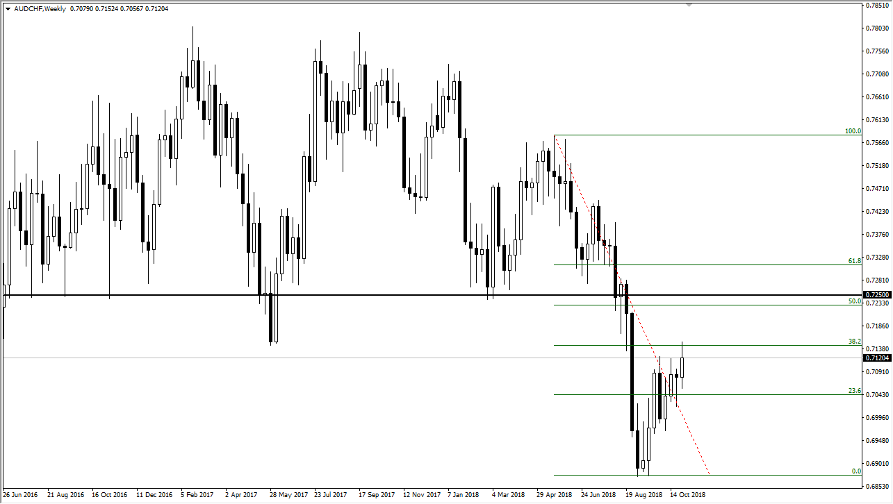 The Australian dollar has bounced a bit against the Swiss franc and other currencies during the last 30 days. October was reasonably good, but we had been massively oversold to going into the month, so it makes sense that we got a bit of a bounce. Volatility and of course risk aversion has come back into the marketplace, so I think at this point we are looking at the high likelihood of selling pressure above. Remember, the Australian dollar is considered to be a “riskier currency”, while the Swiss franc is certainly a bit of a safe haven in and of itself.