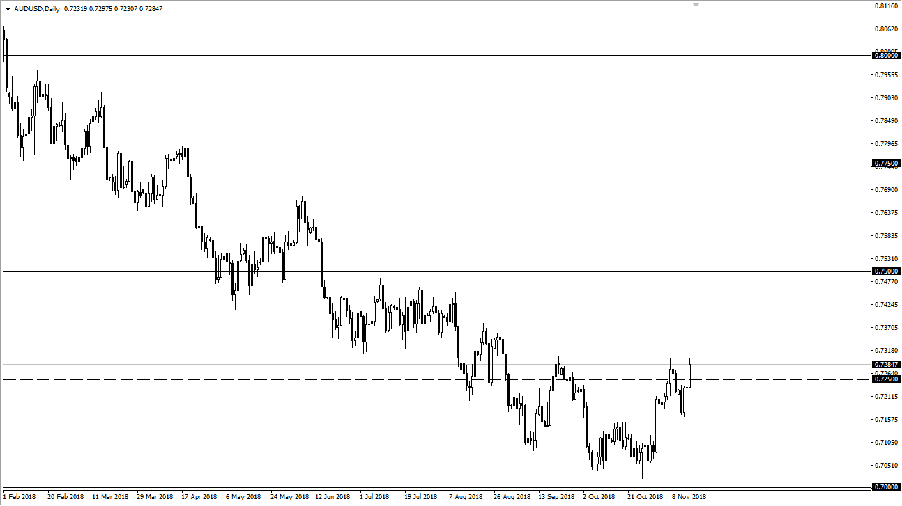 The Australian dollar has rallied significantly during Thursday as well but continues to struggle with the 0.73 level. We got good employment figures out of Australia, which of course helped the market. We have seen a bit of a more “risk on” move in general later in the day, so that helps the Australian dollar as well. I believe this point the market is still hovering around the 0.7250 level as a general rule, and I recognize that the 0.73 level above is significant resistance. If we were to break above that level, then I think we could go to the 0.75 handle. Overall, if we pull back from here, I think that the 0.7150 level would probably offer support. I also recognize that a break down below there could have this market looking towards the 0.70 level. Without a doubt, the most important thing for this pair is going to be the trade war between the United States and China, so keep an eye on those headlines.