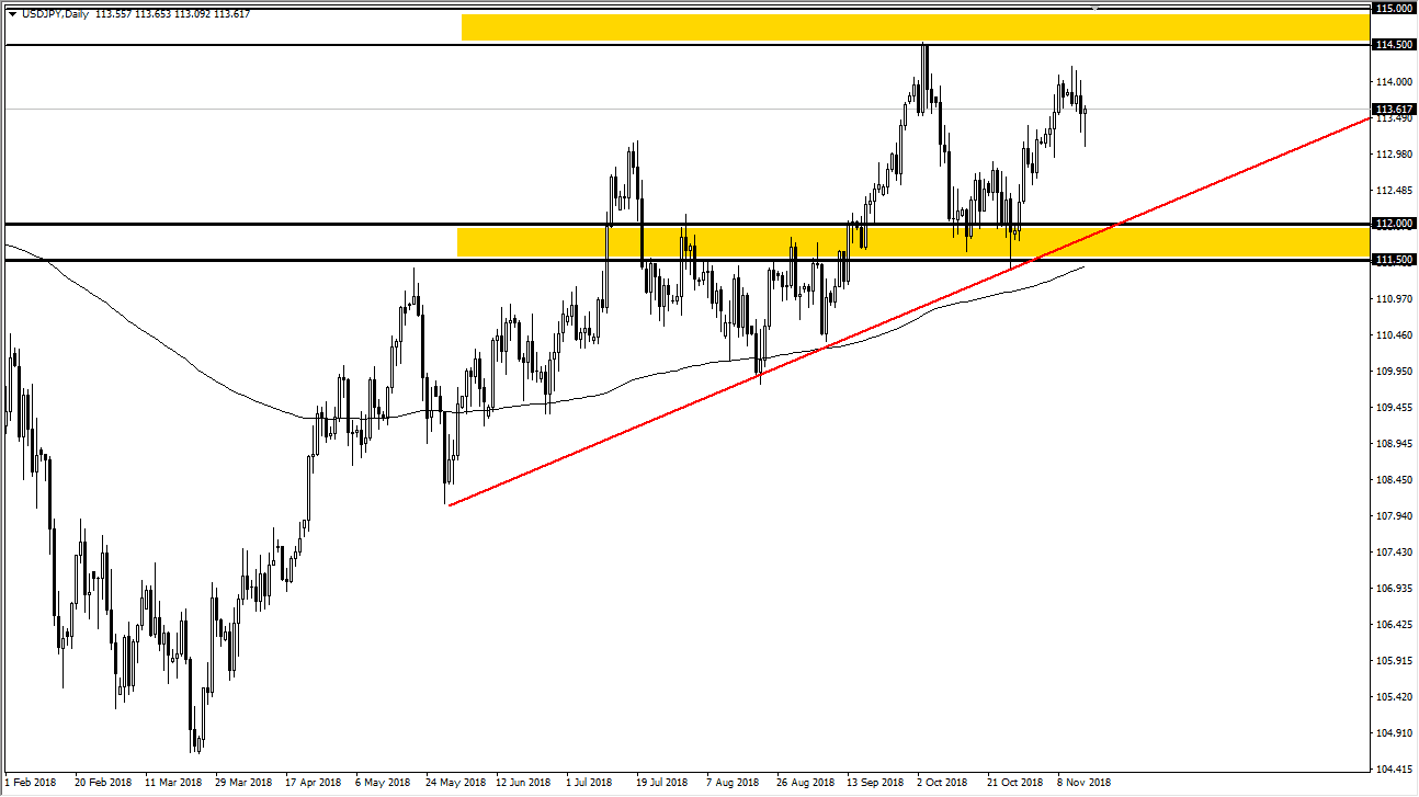 The US dollar fell initially during trading on Thursday but bounced significantly from the ¥113 level to form a bit of a hammer. It looks as if the market is still trying to fight, and perhaps save itself from breaking down. I do think that there are buyers underneath anyway, and I don’t think that even though we have had a major turnaround over the last several days, I think that the market certainly will favor the US dollar longer-term due to the interest rate differential. However, we have bounced quite hard and there is a certain amount of risk appetite that’s attached to this market. The uptrend line continues offer support, just as the ¥112 level and the 200 day EMA do. Ultimately, I like the idea of buying pullbacks, as we will need to build up a significant amount of momentum to break through the massive resistance above that extends to the ¥115 level.