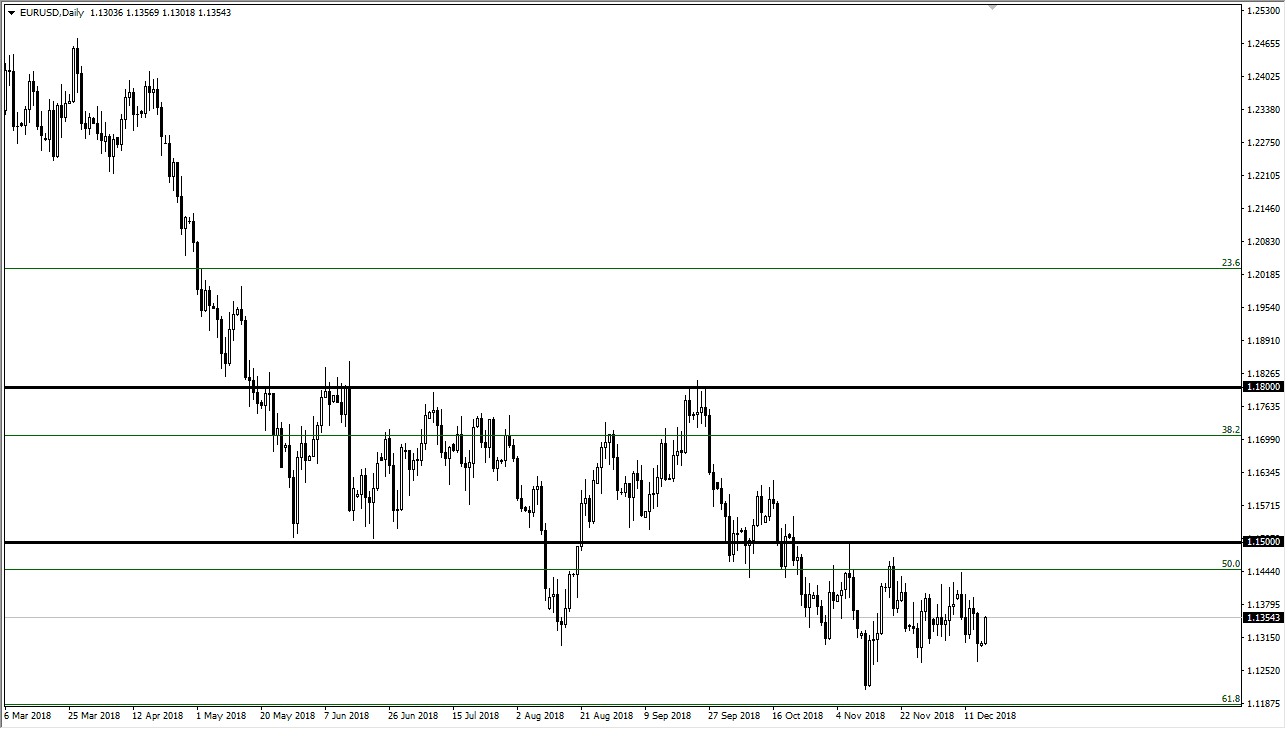 The Euro rallied a bit during the trading session on Monday but is still within consolidation. This is a market that of course will continue to be noisy overall, as we await the Federal Reserve interest rate announcement, and more importantly the statement afterwards. I believe that the statement will be parsed as we try to figure out how the Federal Reserve will react next year. If they have a bit more dovish statement than anticipated, this could send this pair much higher. However, Jerome Powell sounds a bit more hawkish or at least willing to stick with an extra three interest rate hikes next year, we could see this market drop. Overall though, I think we are looking at a lot of sideways action. Choppiness will continue to be the way of this pair. I believe that the 1.15 level above is significant resistance and might be very difficult to break above anytime soon.