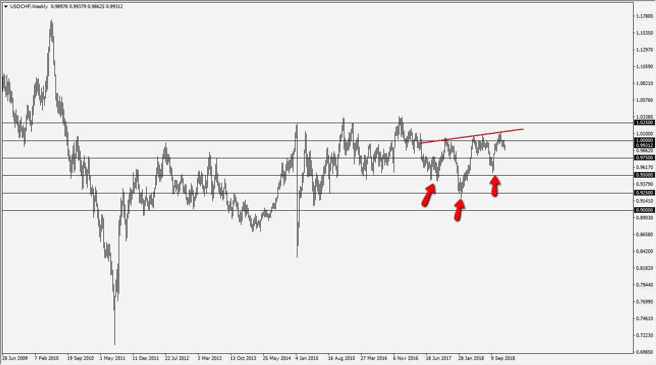 Ultimately, the inverted head and shoulders is still only a potential inverted head and shoulders, but once we break that neck line I am going to be long of this market, and simply hold. Otherwise, we very well could see the market drifting down to the 0.95 handle. This market is notoriously slow at times, but it should also be noted that the interest rate differential certainly favors the US dollar as the Swiss are still with negative real rates. I suspect that we are about to see a move higher in 2019. Breaking below the 0.95 level negates the inverted head and shoulders, and drives this pair towards the 0.90 level, a move that I currently have at about 20% probability.