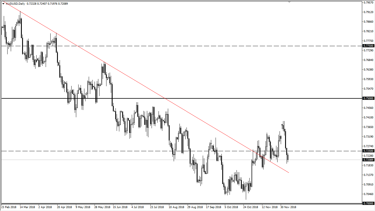 The Australian dollar also fell during the day, but it seems as if it is well supported just below the 0.72 handle. Because of this, I think that it’s only a matter time before the buyers come in and try to pick up value, especially if we get some type of positive words coming from China about the US/China trade negotiations. That of course has a massive effect on the Australian dollar in general, and as a major contributor of raw materials to the Chinese economy, it makes sense that it will go up and down with the economic prospects of the mainland.