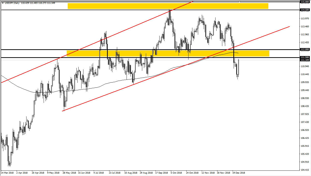 The US dollar has exploded to the upside against the Japanese yen during the trading session on Wednesday, reaching towards the 100 level ¥0.50 level. This is an area that should offer resistance, and of course we have the 200 day EMA just above that. We have broken through major support, and it’s very likely that sellers should return. I think at this point; the US dollar has got ahead of itself and this bounce may be due to lower liquidity than anything else. I have no interest in buying this market, because this was a major technical breakdown that I think leads to much steeper losses. The Japanese yen is expected to be one of the leading currencies after New Year’s, which of course going to put weight upon this market as well.