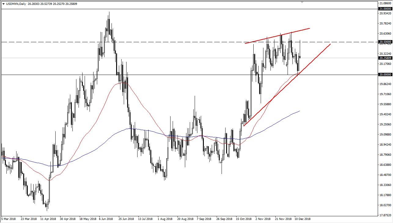 The US dollar has been strengthening overall due to a slowing down of global growth according to economic figures, and therefore you will need to worry about whether oil has any demand. Remember the Mexican peso is highly correlated to crude oil, and emerging markets in general. Emerging markets are a bit erratic at this point, but it does look like oil is trying to find support near the $50 level in the WTI market. If we can stay above the $50 level, then this pair has a chance to rollover and break down. However, if crude oil breaks below the $50 level I suspect that the US dollar will spike against the Mexican peso, and any other Petro currency out there such as the Canadian dollar, Norwegian krone, and so on.