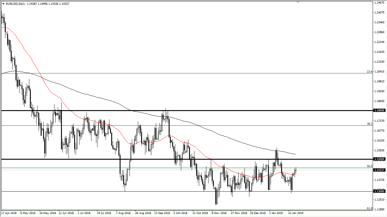 The Euro went back and forth during the trading session on Tuesday, as the 1.1450 level looks to be offering resistance. There is a lot of noise between here and the $15.00 level, so it’s not surprising all to see the market stagnate a bit. Beyond that, we have the FOMC meeting and press conference going on, so the Wednesday press conference coming from the Federal Reserve will be crucial. Traders are trying to figure out whether or not the Federal Reserve is becoming more dovish or are still looking to raise interest rates, so obviously the next 24 hours could be very volatile. I do think that we will try to get to the 1.15 level, but it might take several attempts. If we can break above the 200 day EMA, pictured in black on the chart, then the market could continue to go much higher over the longer-term. I see a massive support at the 1.13 level underneath.
