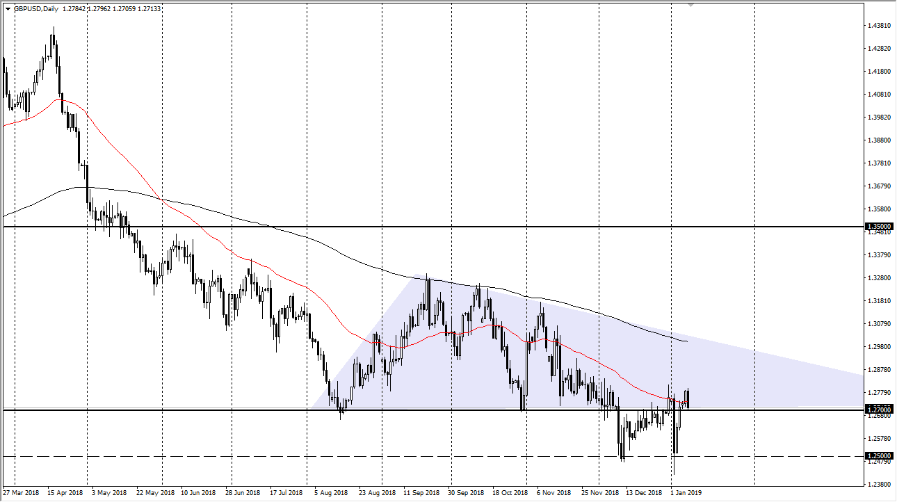 The British pound pulled back during the trading session on Tuesday, reaching towards 1.27 level. This is an area that has been important more than once, and then after a defeat in the British Parliament of the government, it suggests that the British pound is going to continue to struggle overall. I think that a break down below the 1.27 level is a sell signal, and then the 1.25 level will be targeted. Rallies at this point should continue to be faded, or at the very least not bought as I think there are far too many headlines risks out there for the British pound still. I think the one thing that helped the British pound overall is that the US dollar has been a little bit softer due to the Federal Reserve changing its tone as of late. That being the case, I expect a grind lower more than anything else.