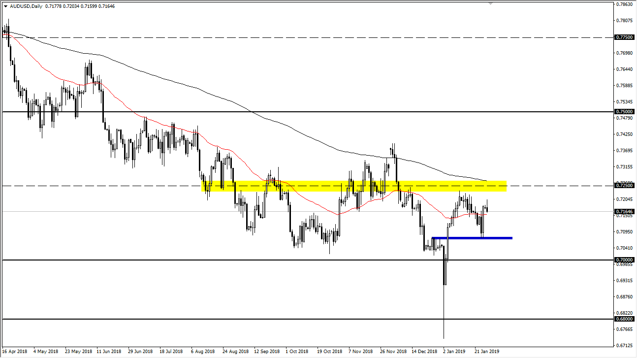 The Australian dollar initially tried to rally during the trading session on Monday, but then pulled back a bit near the 0.72 handle. I think at this point we are looking to rollover but you can also see that I have a blue rectangle underneath that should represent support, based upon the “tweezer bottom” that we made on Thursday and Friday. Even if we break down below there, I think there is plenty of support at the 0.70 level that extends down to the 0.68 level. There is massive amounts of support in that area, and I think that we will have plenty of buyers in that general vicinity, so even though we are rolling over, I think that it’s a nice buying opportunity for a longer-term move. Keep in mind that the Australian dollar is highly sensitive to the US/China trade talks, which of course are going on this week. That of course will move this market.