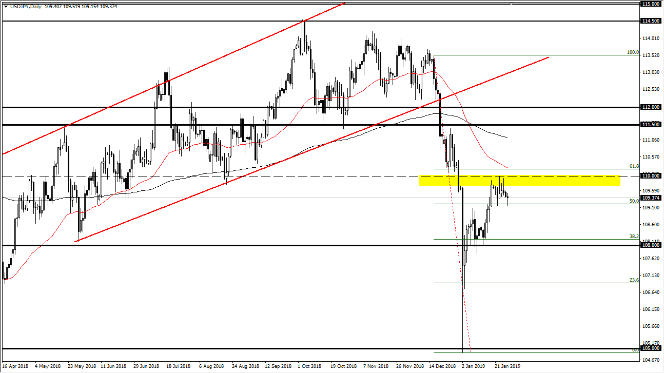 The US dollar has pulled back a bit against the Japanese yen, but also bounced to form a less than impressive negative candle stick. However, we do have a couple of shooting stars above that should continue to cause significant resistance, with the ¥110 level of course being important. The 61.8% Fibonacci retracement level is just above there, just as the 50 day EMA is. That being the case, I think that the market is ready to roll over, but we may have to consolidate in this area. If we can break down below the lows of the trading session on Monday, then I think we will probably continue to go lower, perhaps reaching towards the ¥108 level an area that should be massively supportive. Alternately, if we were to break above the 61.8% Fibonacci retracement level, then I think we could go towards ¥111, but that doesn’t seem to be so likely at this point.