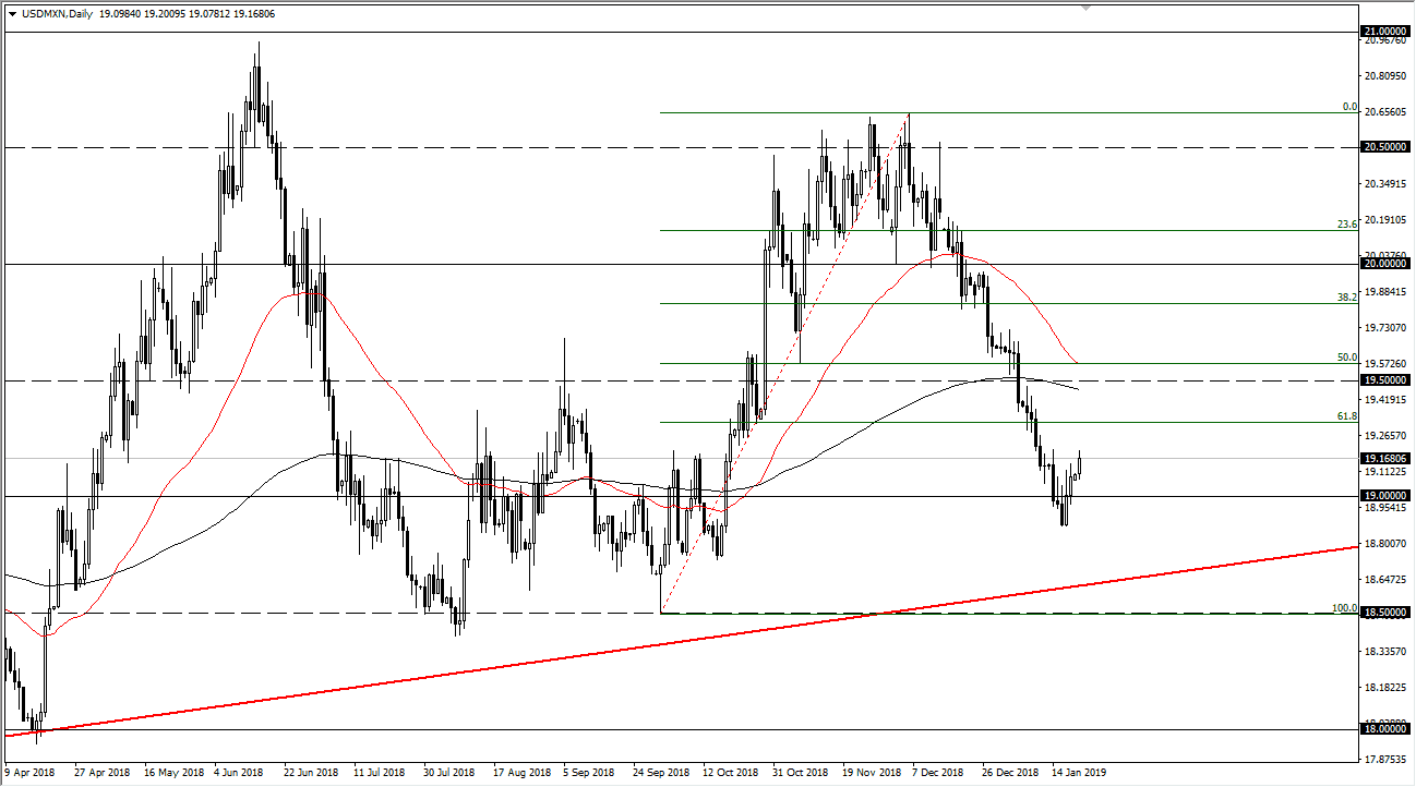 The US dollar rallied a bit against the Mexican peso during relatively quiet trading on Monday, as it was Martin Luther King Jr’s birthday, which of course is a national holiday in America. That being the case, it’s likely that we will continue to see a bit of a bounce from here, which we have gotten a bit overextended. However, I think it’s only a matter of time before we ran into selling pressure, perhaps near the 200 day moving average again, but it’ll be interesting to see how this plays out. Remember, the Mexican peso is highly sensitive to the crude oil market, which does look like it’s trying to break out to the upside. If it does, that will continue to put bearish pressure on this market.