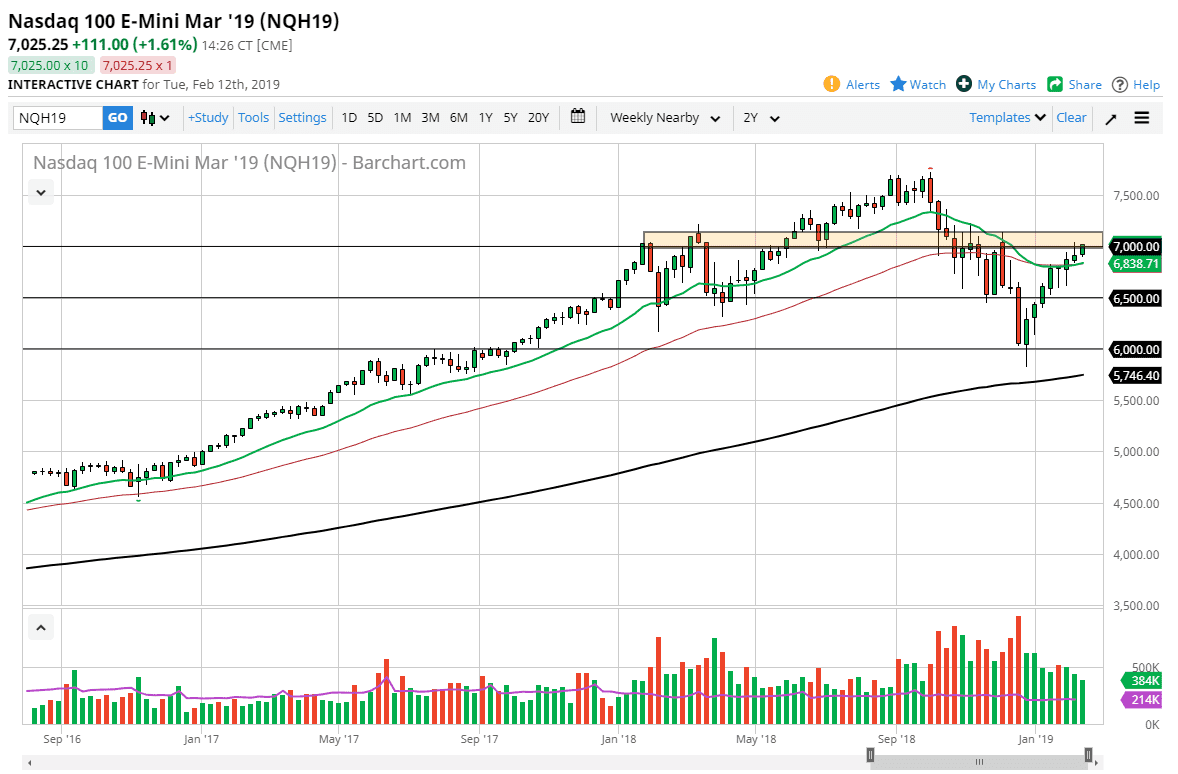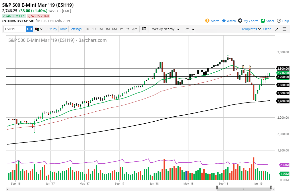 The S&P 500 initially dipped slightly during the trading session on Tuesday but found plenty of support at the 2700 level. Because of this, the market rallied rather significantly, and perhaps even more importantly, have broken above the top of the shooting star from the previous session, which of course is a very bullish turn of events. I think at this point it’s likely that the market will go looking towards the 2800 level based upon the potential government shutdown being possibly averted, and then of course signs of the US/China situation looking a little bit better after comments by Donald Trump. At this point though, I think the 2800 level is going to be very difficult to get above so I think that the upside is probably somewhat limited to that level unless of course we get some type of deal.