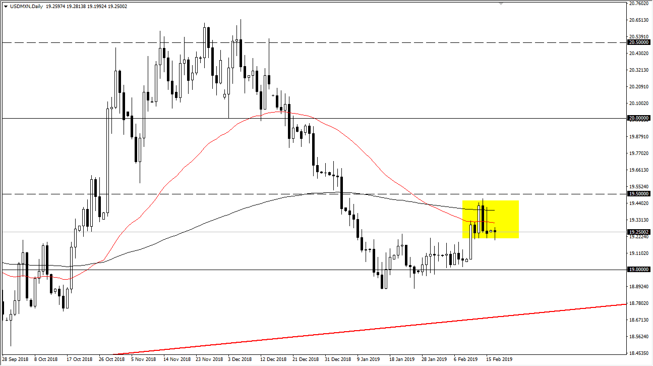 The US dollar fell slightly against the Mexican peso to kick off the trading session on Monday, but keep in mind that it was Presidents’ Day in the United States, and by far the biggest producer of volume in this pair will be the United States during north American trading. In other words, there was very little to move the market during the day so it’s not a surprise that we ended up basically unchanged.