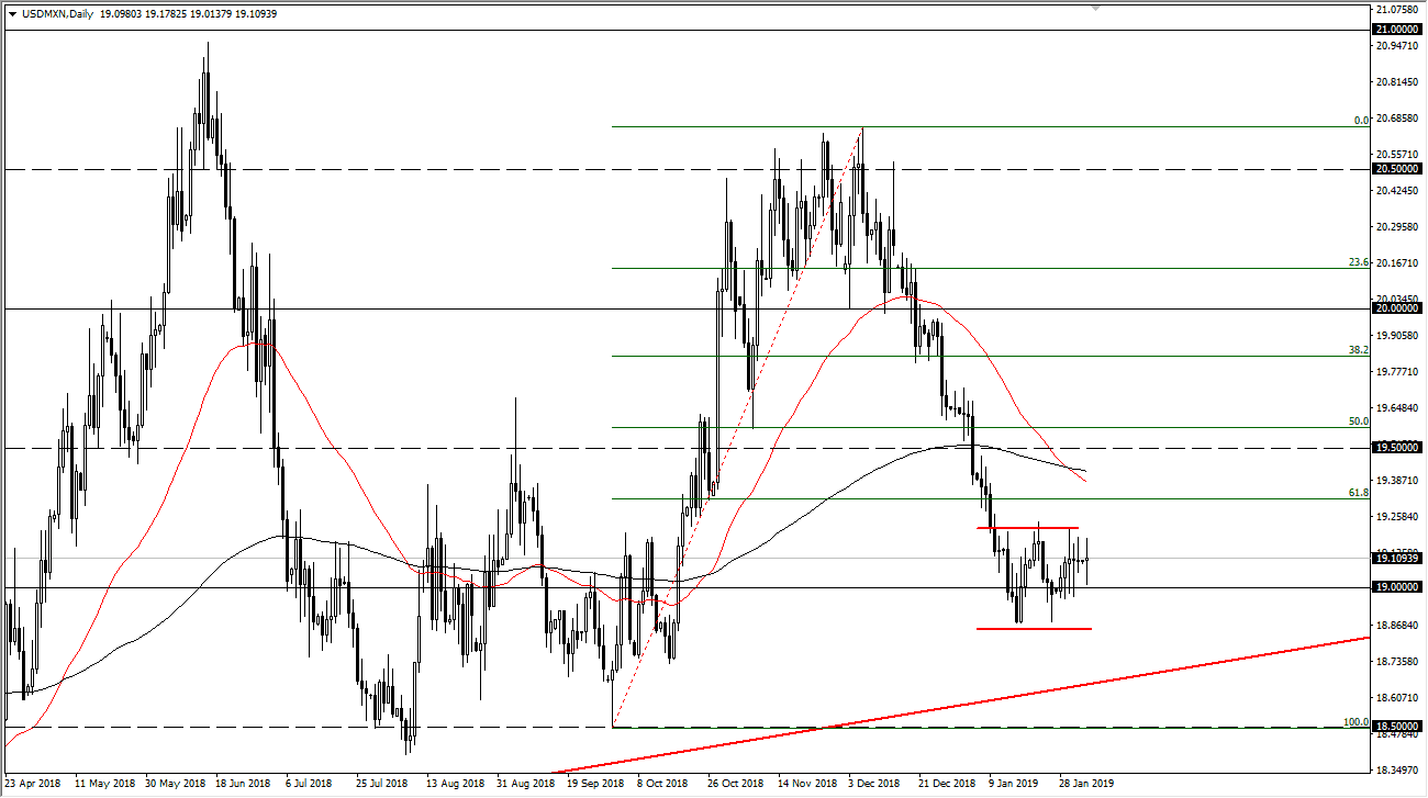 The US dollar has gone back and forth quite a bit against the Mexican peso to kick off the week, as we continue to test the 19 pesos region. As you can see, the action lately has been very choppy as we have a lot of neutral candles in a row, suggesting that we may be getting ready to see an impulsive move. I also have drawn a couple of lines representing support and resistance in this tight area, so when we break out of it I would expect that to be the beginning of the next major move.