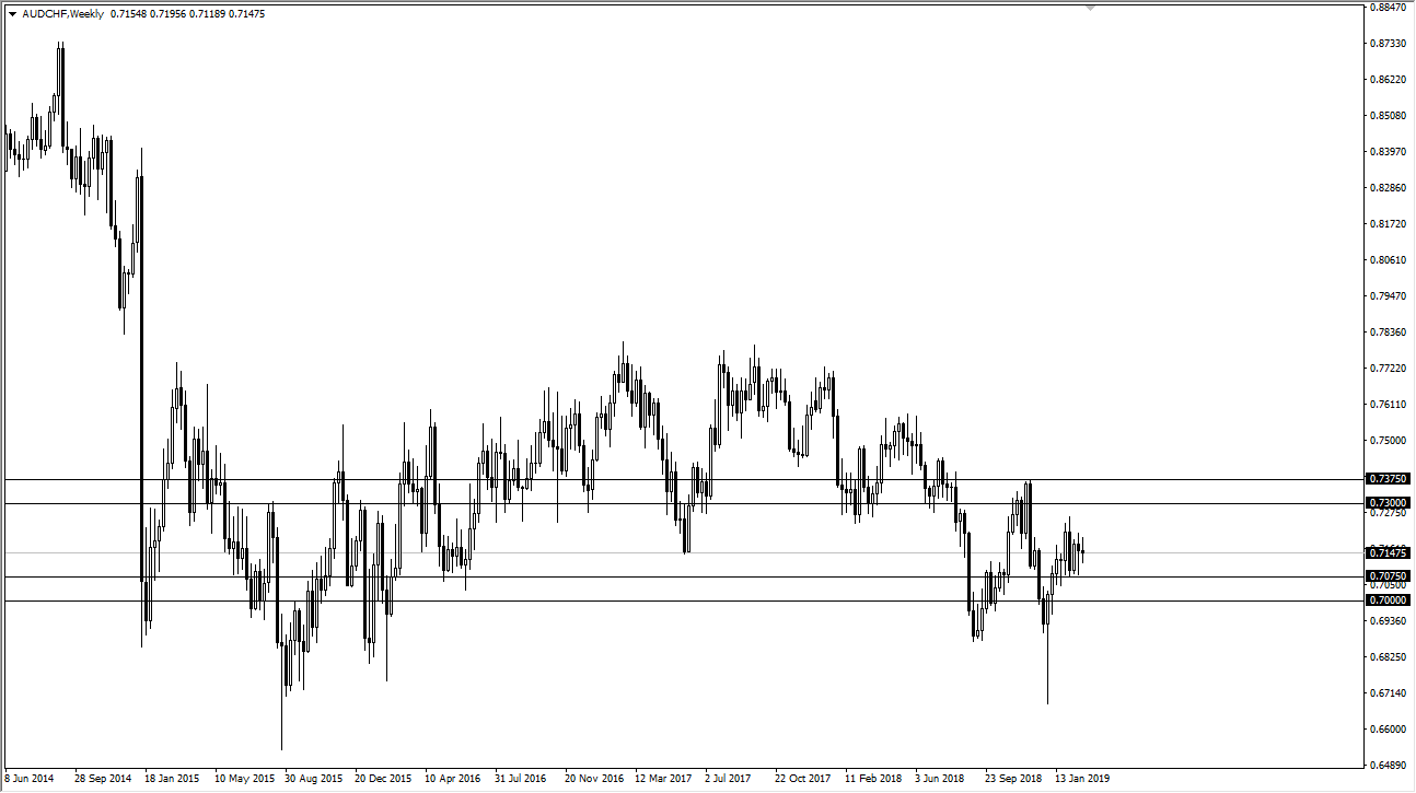The Australian dollar has chop around against many of the world’s largest currencies, and the Swiss franc hasn’t been any different. When you look at this weekly chart, it looks identical to the US dollar, which makes quite a bit of sense considering that the US dollar is trading at parity with the franc. That being said, we have a major support level just below that should continue to contain this market and we are very likely to see a bit of a “double bottom” on the weekly, if not monthly charts.