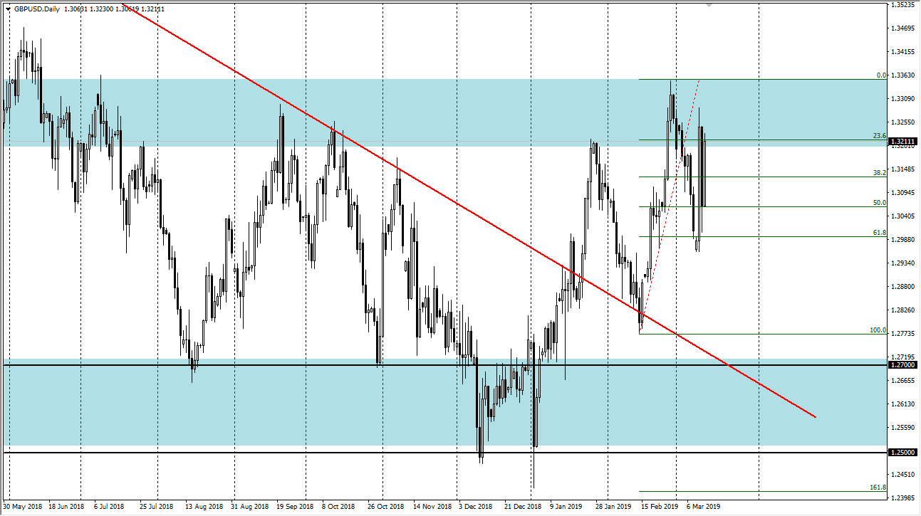 The British pound rallied a bit during the trading session on Wednesday in preparation of the parliamentary vote, but at the end of the day we are simply consolidating overall. We have wiped out the selloff during the previous session, and we still have all of the same support and resistance levels to pay attention to. The 1.30 level underneath is supportive as it clusters around the 61.8% Fibonacci retracement level, but at the same time there is a significant amount of resistance at the 1.3375 handle. Ultimately, this is a “buy on the dips” scenario, unless of course for some reason the parliament votes to leave the European Union without any type of agreement. That seems to be very unlikely, but even if it does I suspect it will only be an opportunity to buy the British pound at much lower levels.