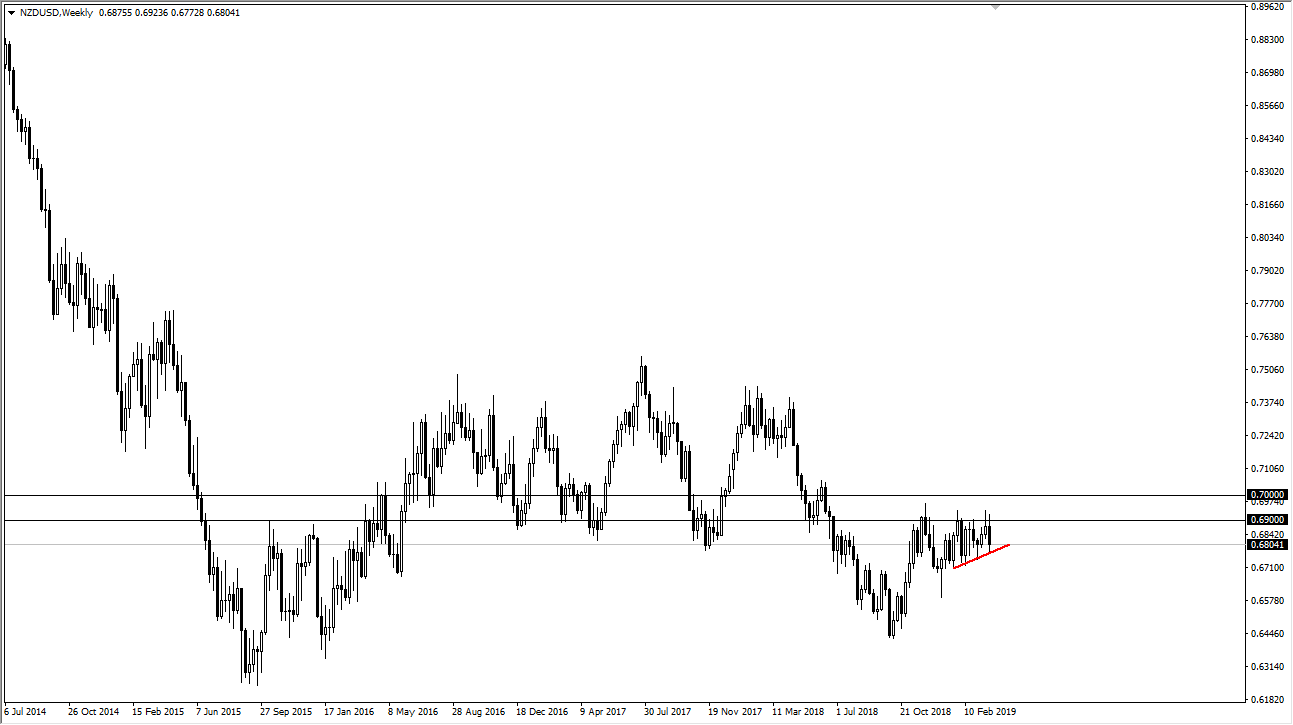 The New Zealand dollar has been very choppy over the last several months but has been drifting higher. In fact, even though the Royal Bank of New Zealand has suggested that the next move might be an interest rate cut, it’s hard to ignore the fact that there is a major uptrend line that is being respected. Beyond that, we could be forming a bit of an ascending triangle if you ignore the wick on the hammer at the bottom of it.